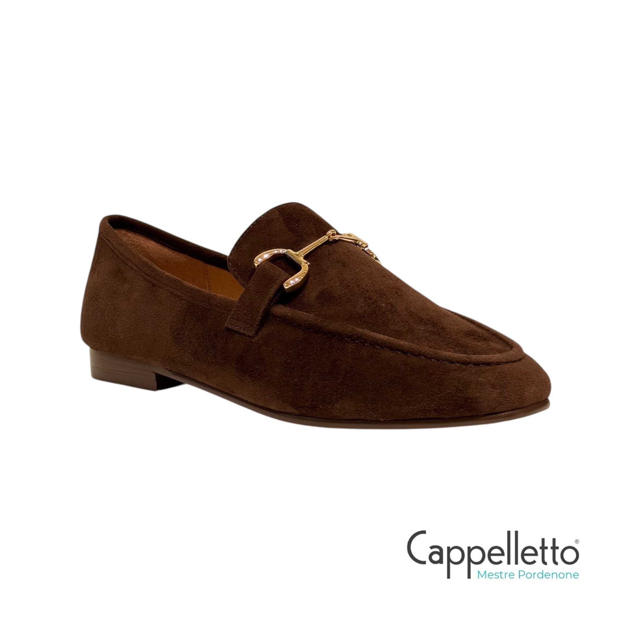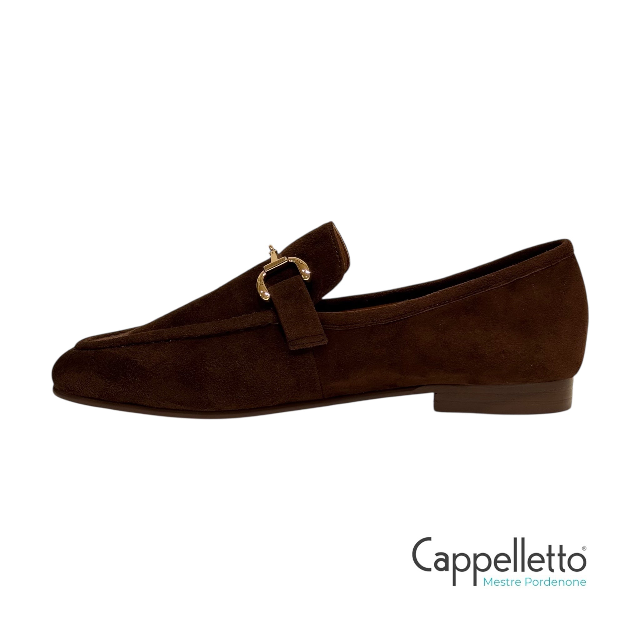 Mocassini da donna in camoscio marrone di Bibi Lou con punta squadrata, dettagli in metallo e tacco piatto di 2 cm.