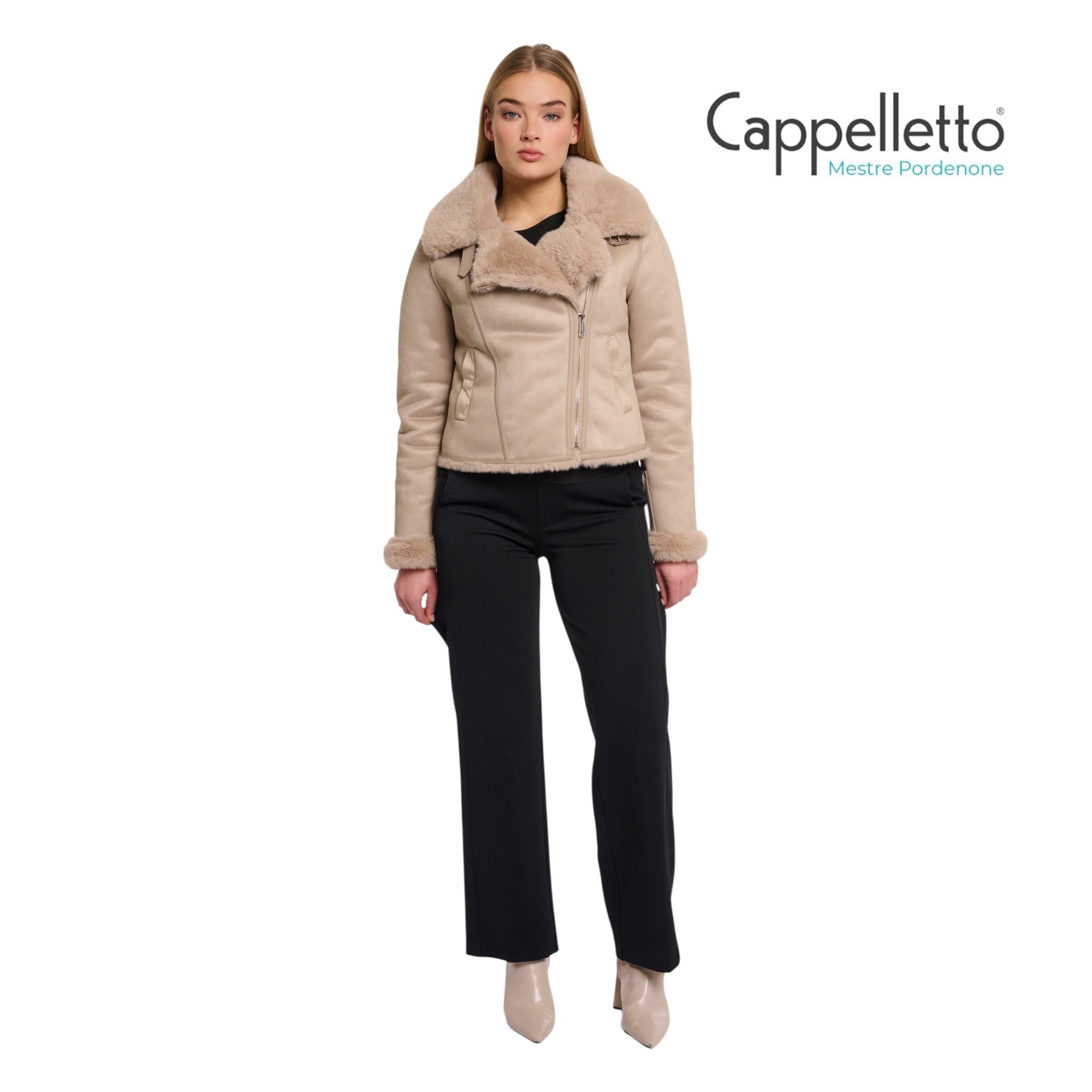 Splendida giacca biker che presenta un colletto con revers in pelliccia sintetica con cinturino e fibbia, polsini in pelliccia sintetica con dettagli a cerniera, chiusura frontale con cerniera e tasche oblique con bottone a pressione.