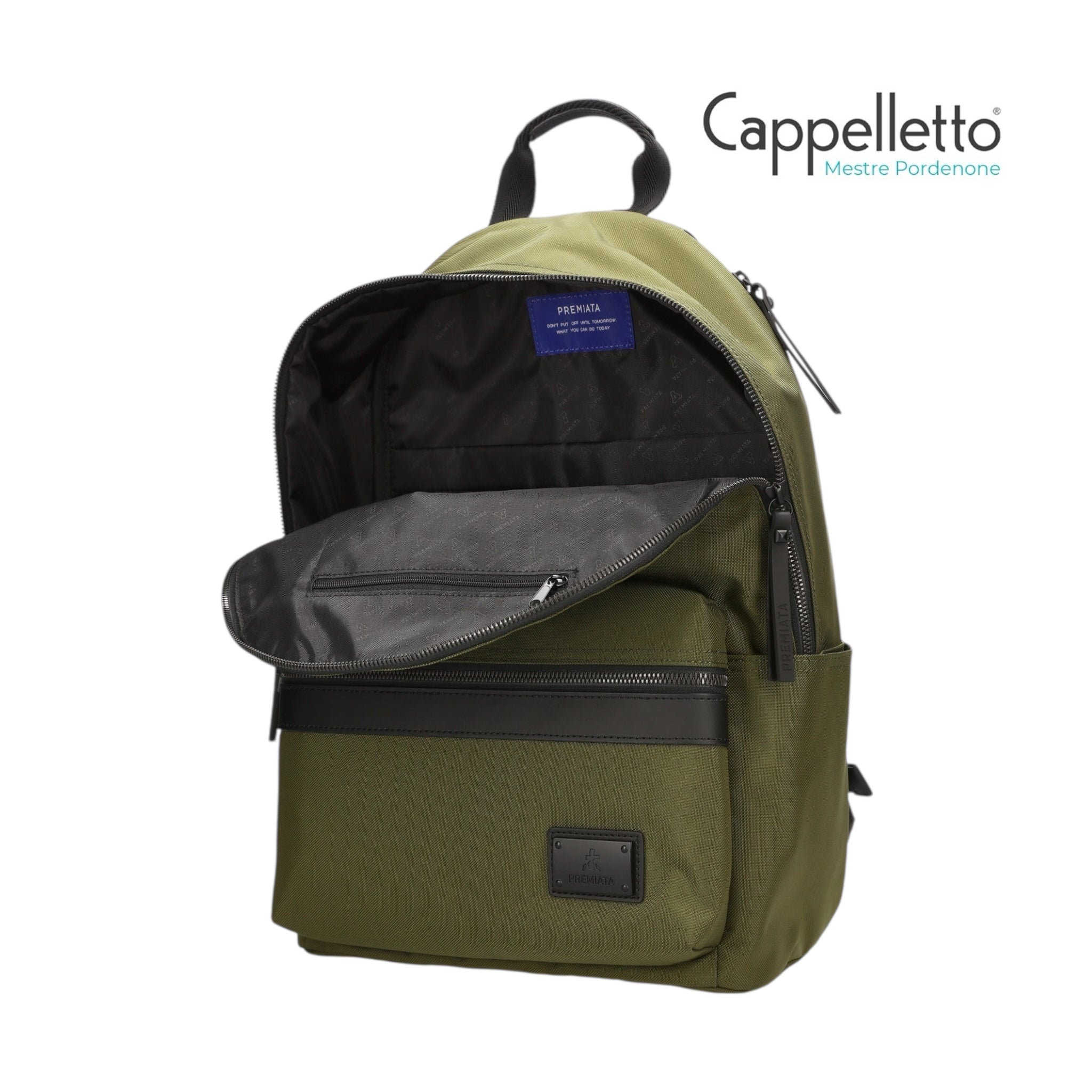 Tasche frontali impermeabili con finiture in pelle di vitello e chiusure in metallo opaco.