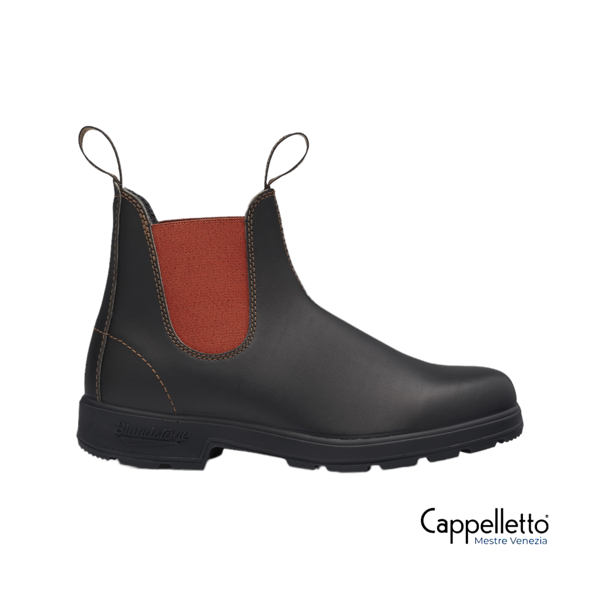 Lo stivaletto in stile Chelsea modello Blundstone #2500 è realizzato in pelle marrone e si caratterizza per l’elastico laterale in un vivace color terracotta.