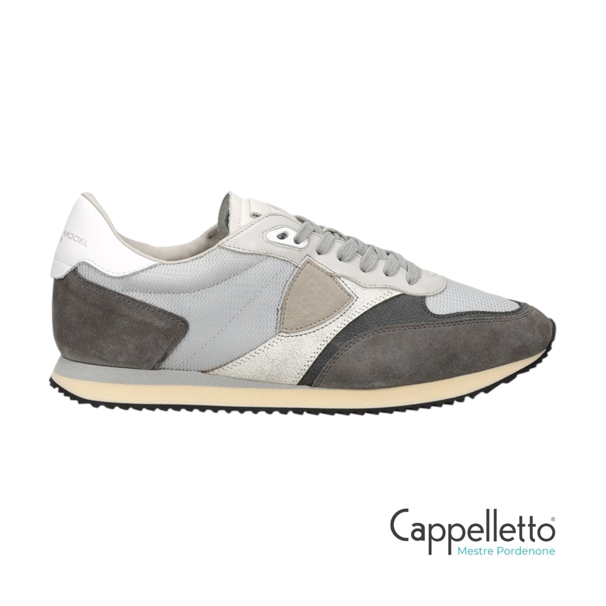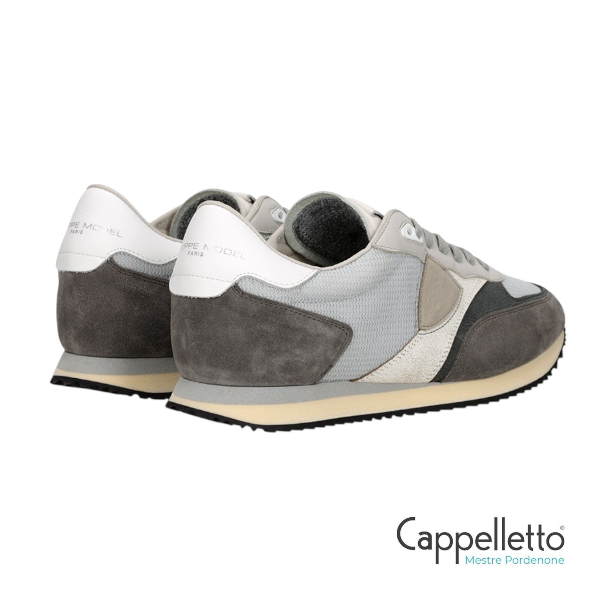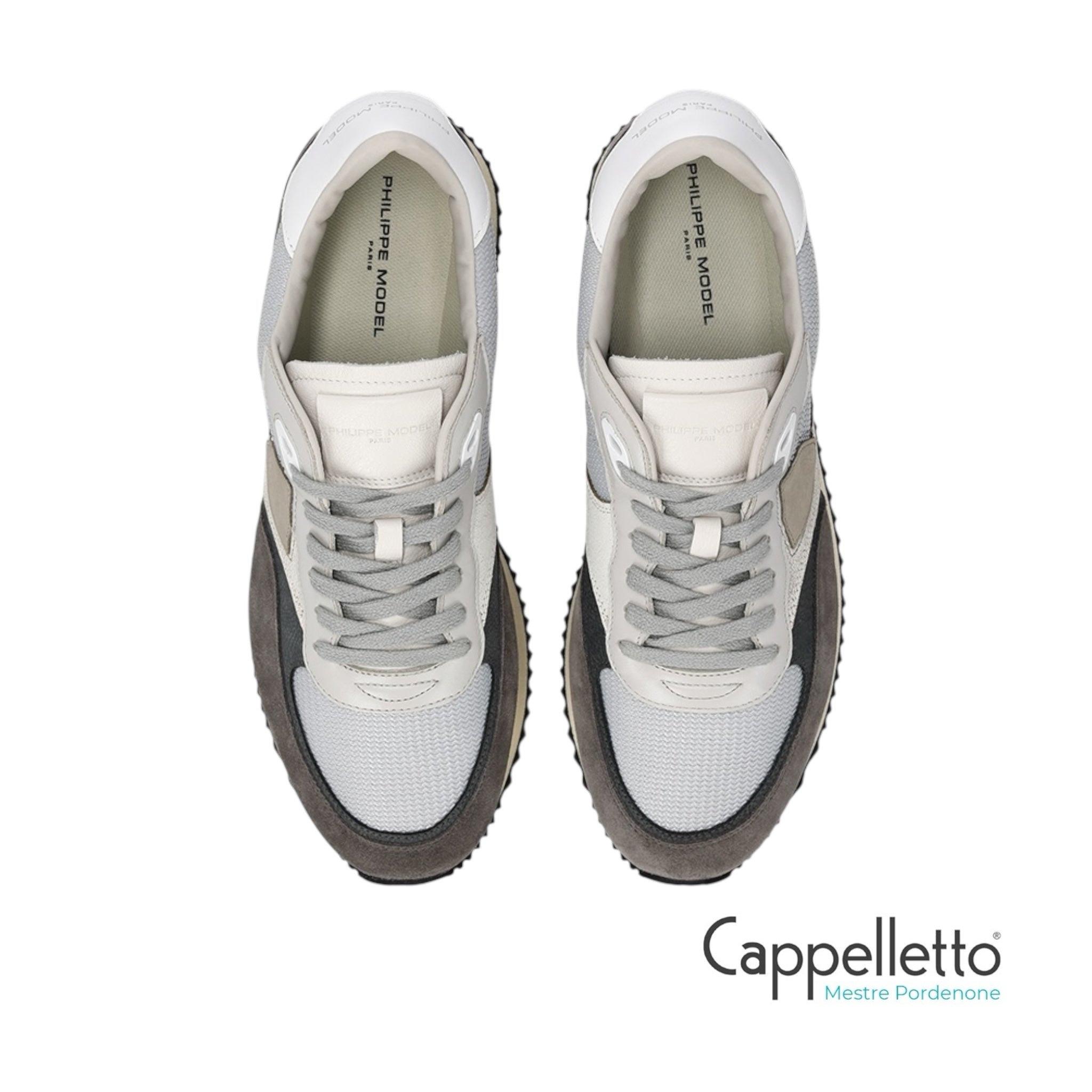 In questa versione, suede e pelle mondial in diverse nuance del grigio si alternano a dettagli bianchi in pelle liscia e craquelé, creando un gioco di texture sofisticato.