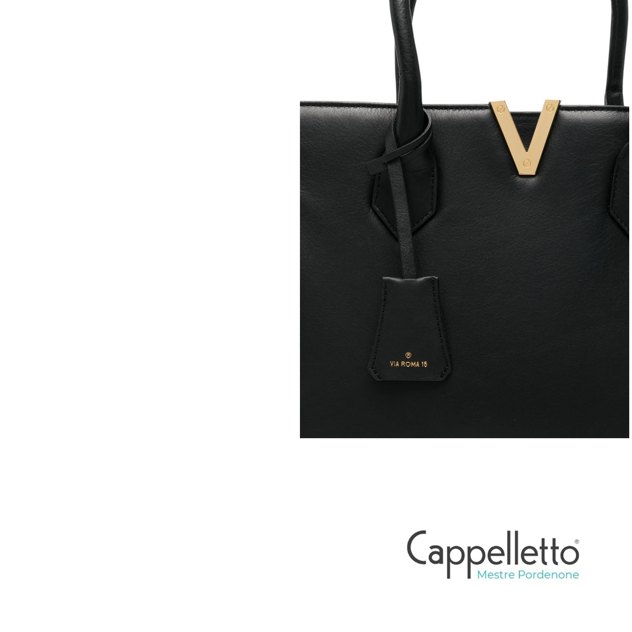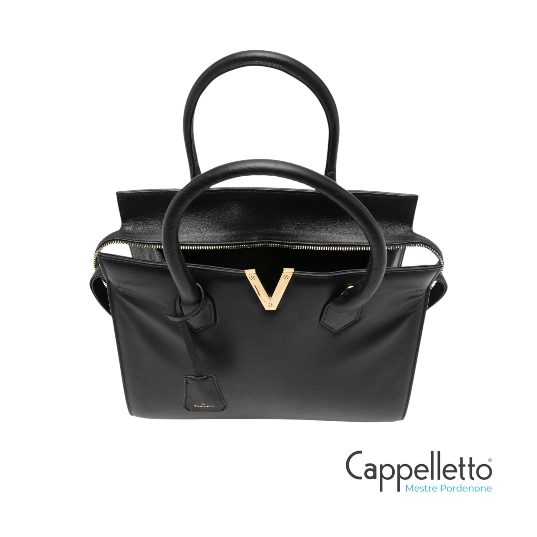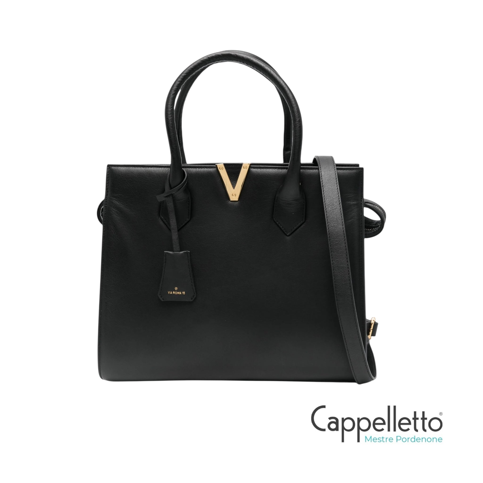 Borsa tote con dettaglio V color oro.