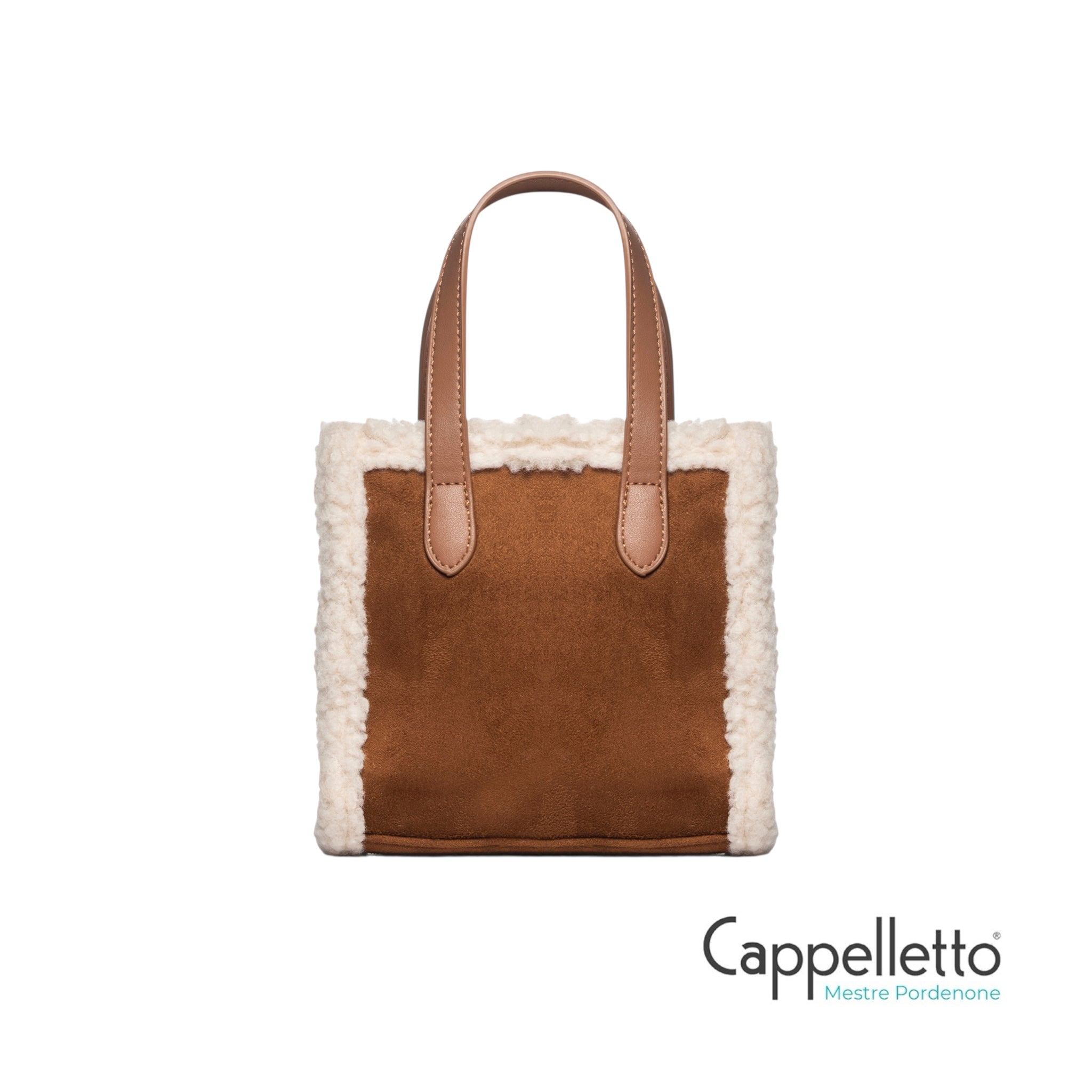 Borsa a mano Buby Suede S in morbido ecosuede con profili in shearling, perfetta per la stagione fredda.