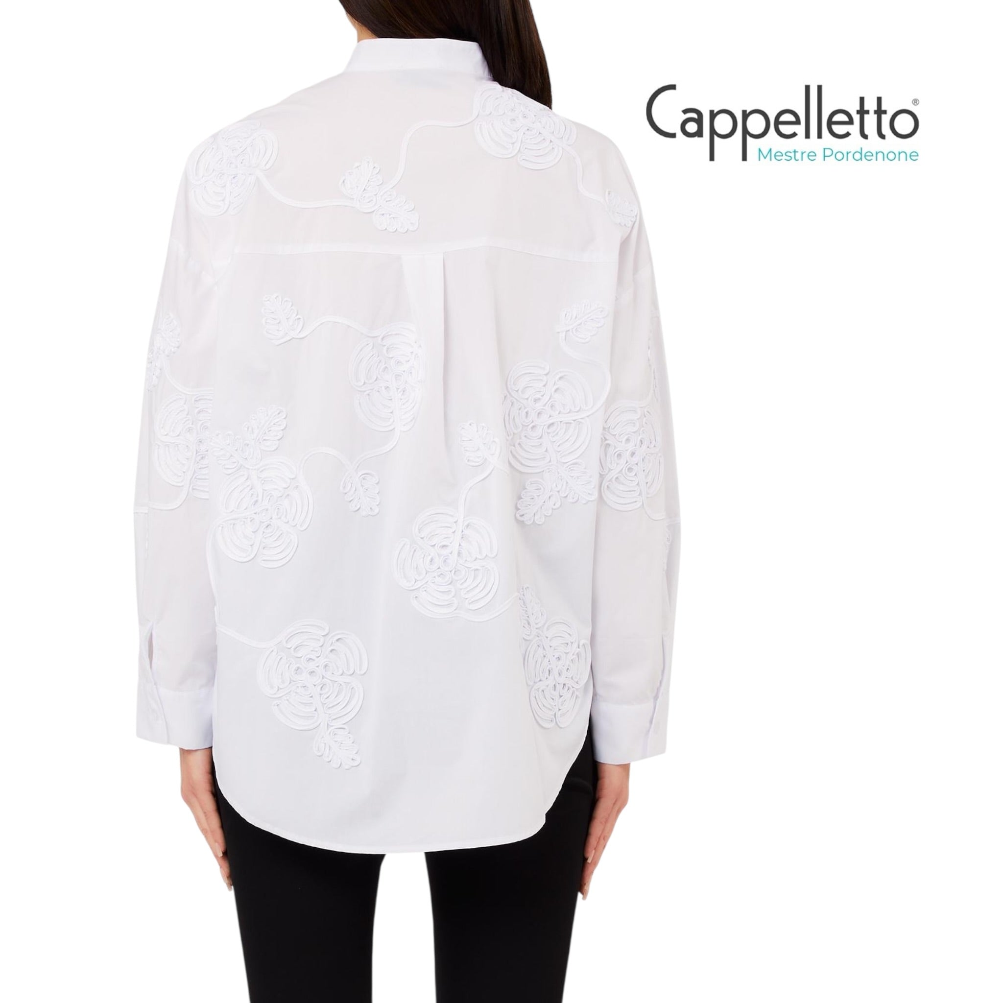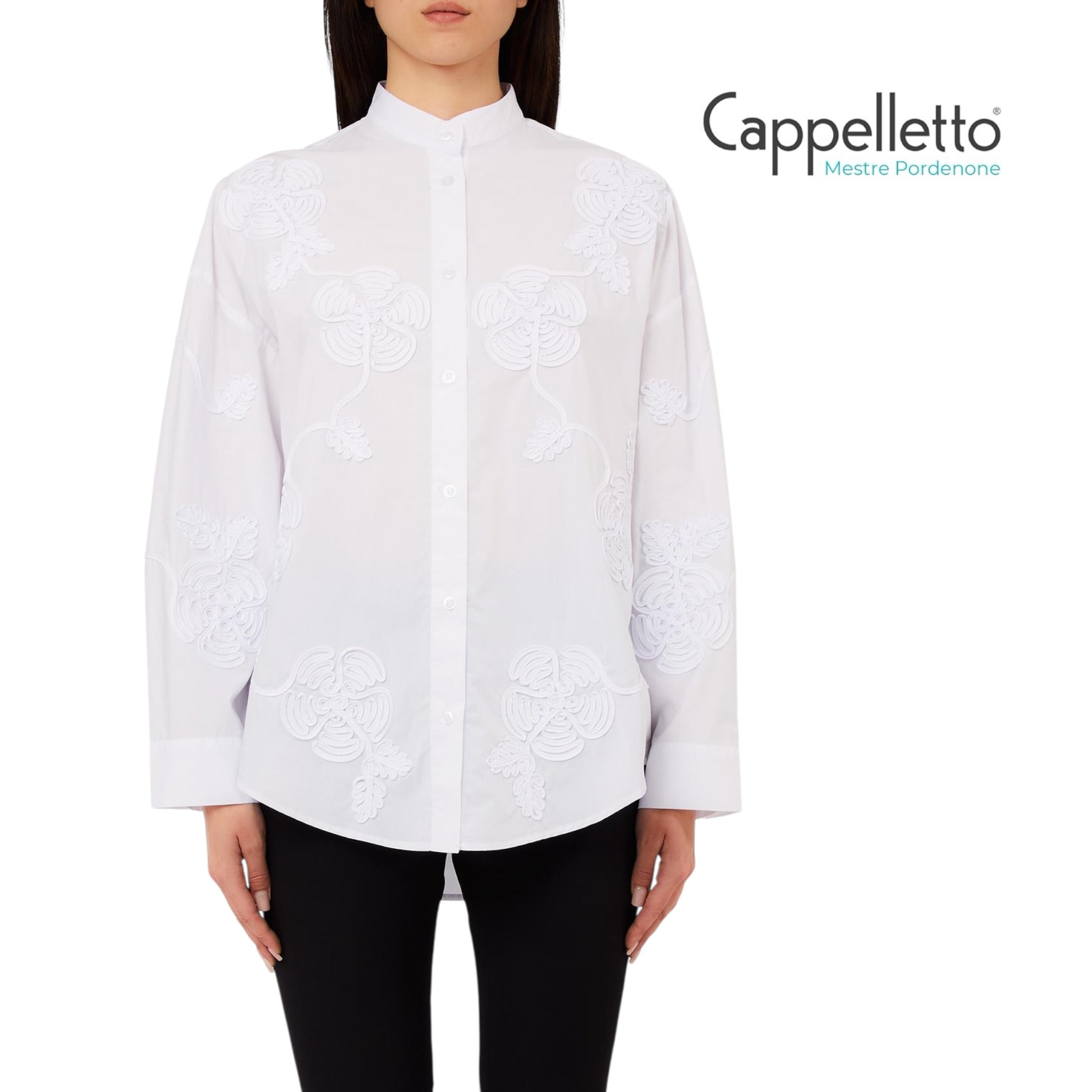Questa camicia con ricamo cornelly trasforma la superficie in un gioco di rilievi quasi scultorei.