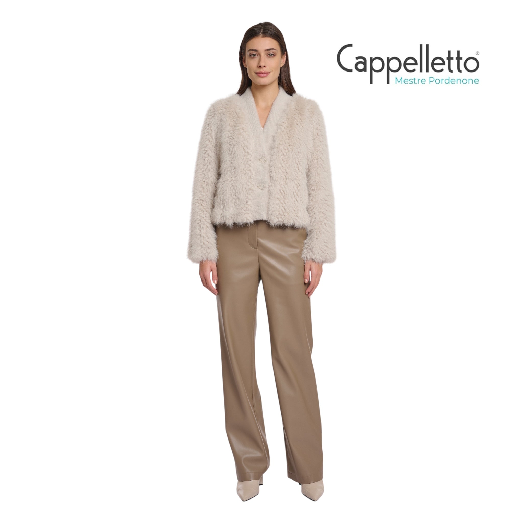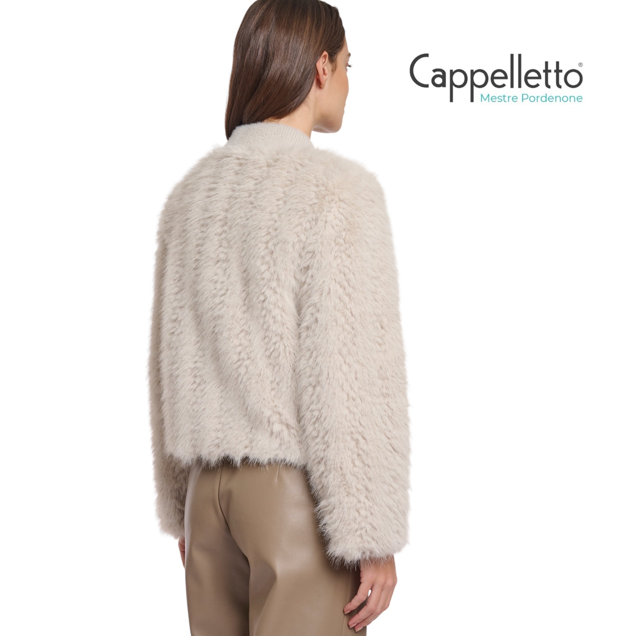 Questo elegante cardigan presenta un corpo in ecopelliccia lussuosamente soffice abbinato a una parte centrale anteriore in maglia a contrasto.