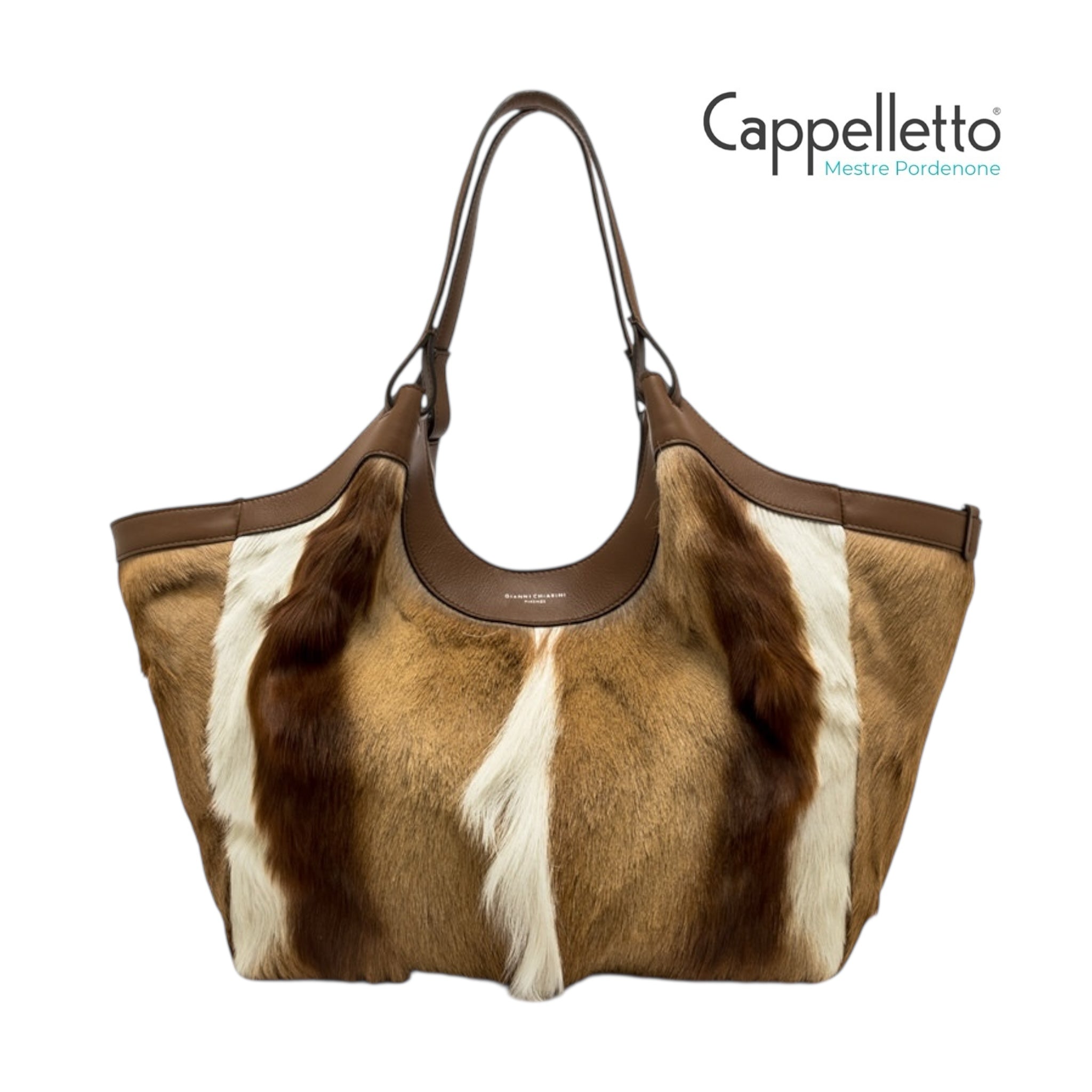 Realizzata in morbida pelle safari, presenta un monoscomparto sfoderato con una pochette interna, profili superiori in pelle martellata e doppi manici in tono. Pratica ed essenziale, è la borsa ideale per completare i look di ogni donna.