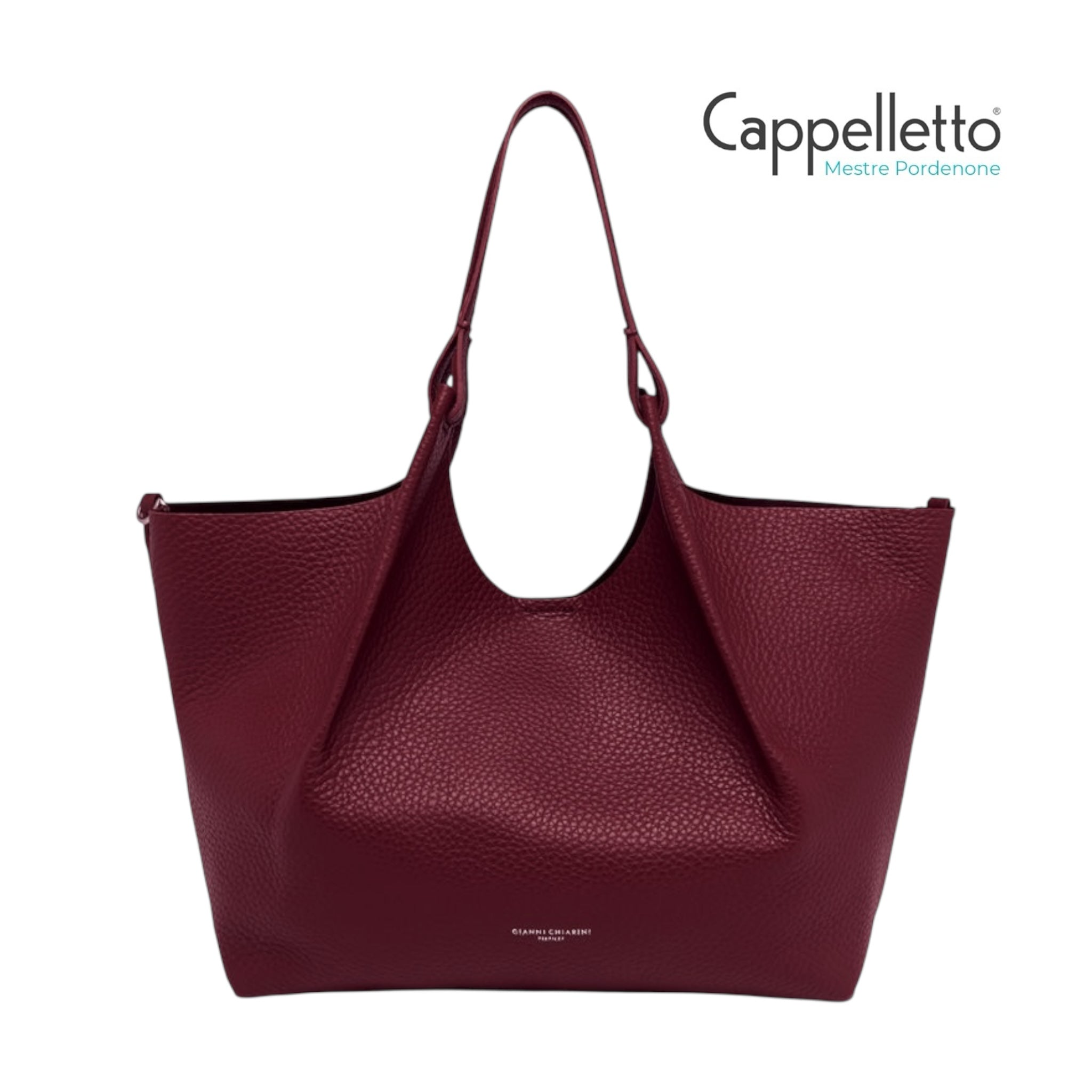 Realizzata in morbida pelle double dalla grana maxi, presenta un monoscomparto sfoderato con una pochette interna, profili superiori in pelle martellata e doppi manici in tono.