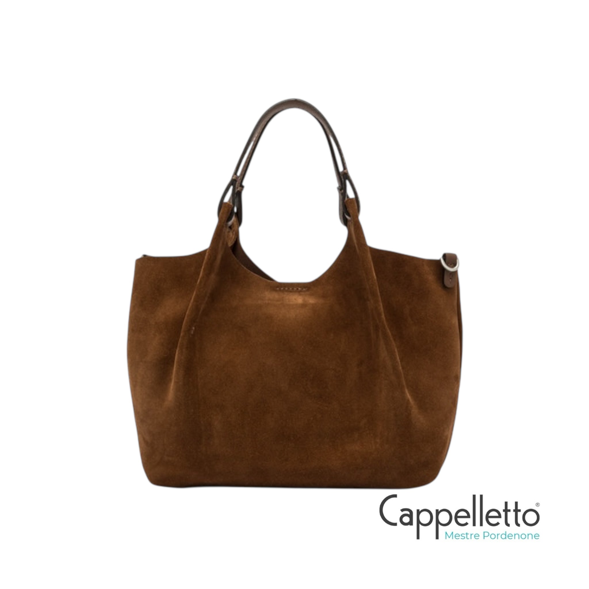 Realizzata in morbida pelle scamosciata, presenta un monoscomparto sfoderato con pochette interna, profili superiori in pelle martellata e doppi manici in tono.