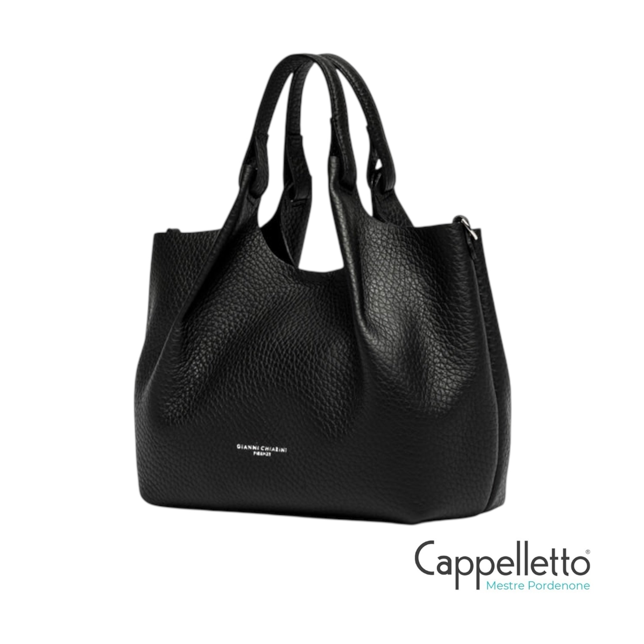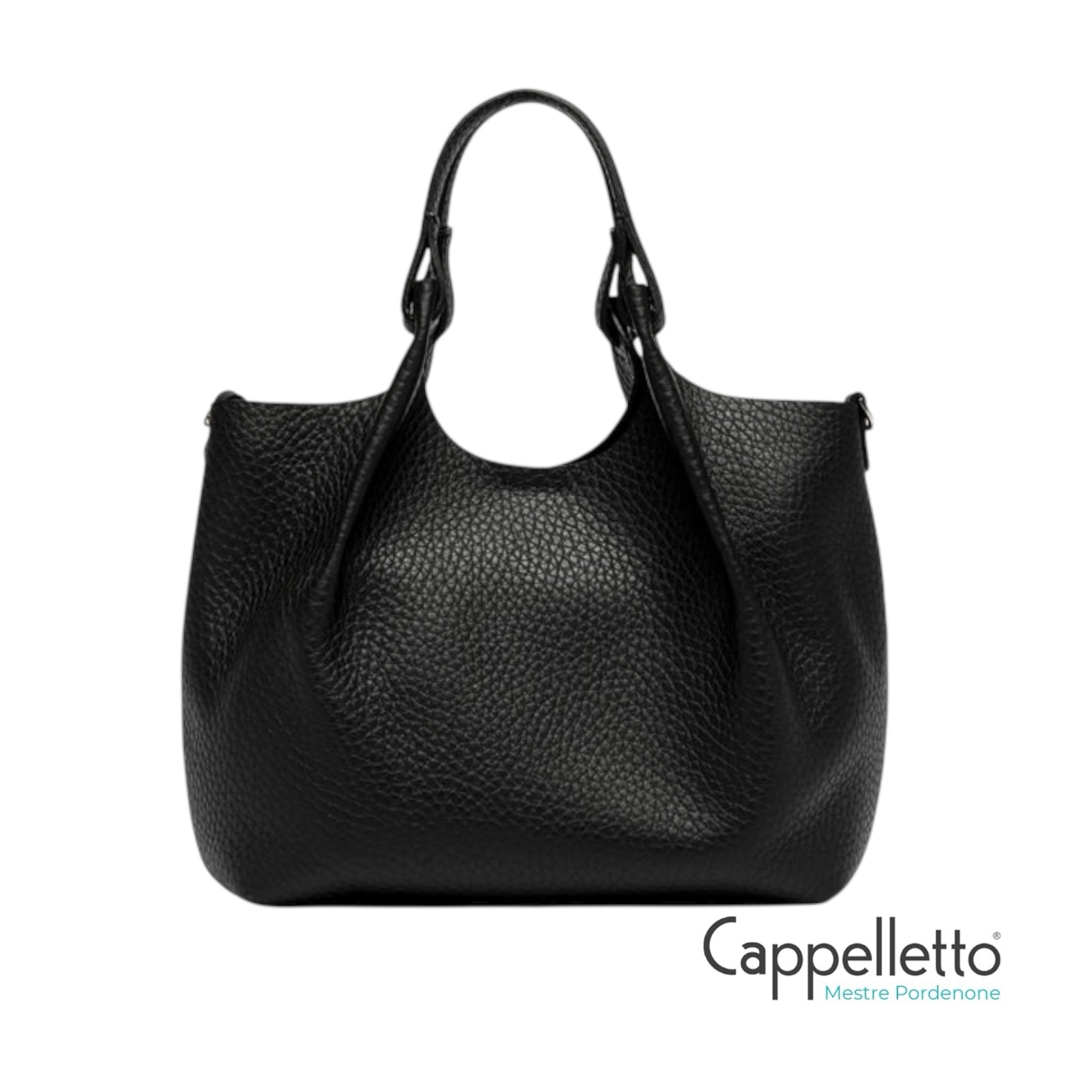 Dotata di un monoscomparto sfoderato, presenta profili superiori in pelle martellata e doppi manici in tono.