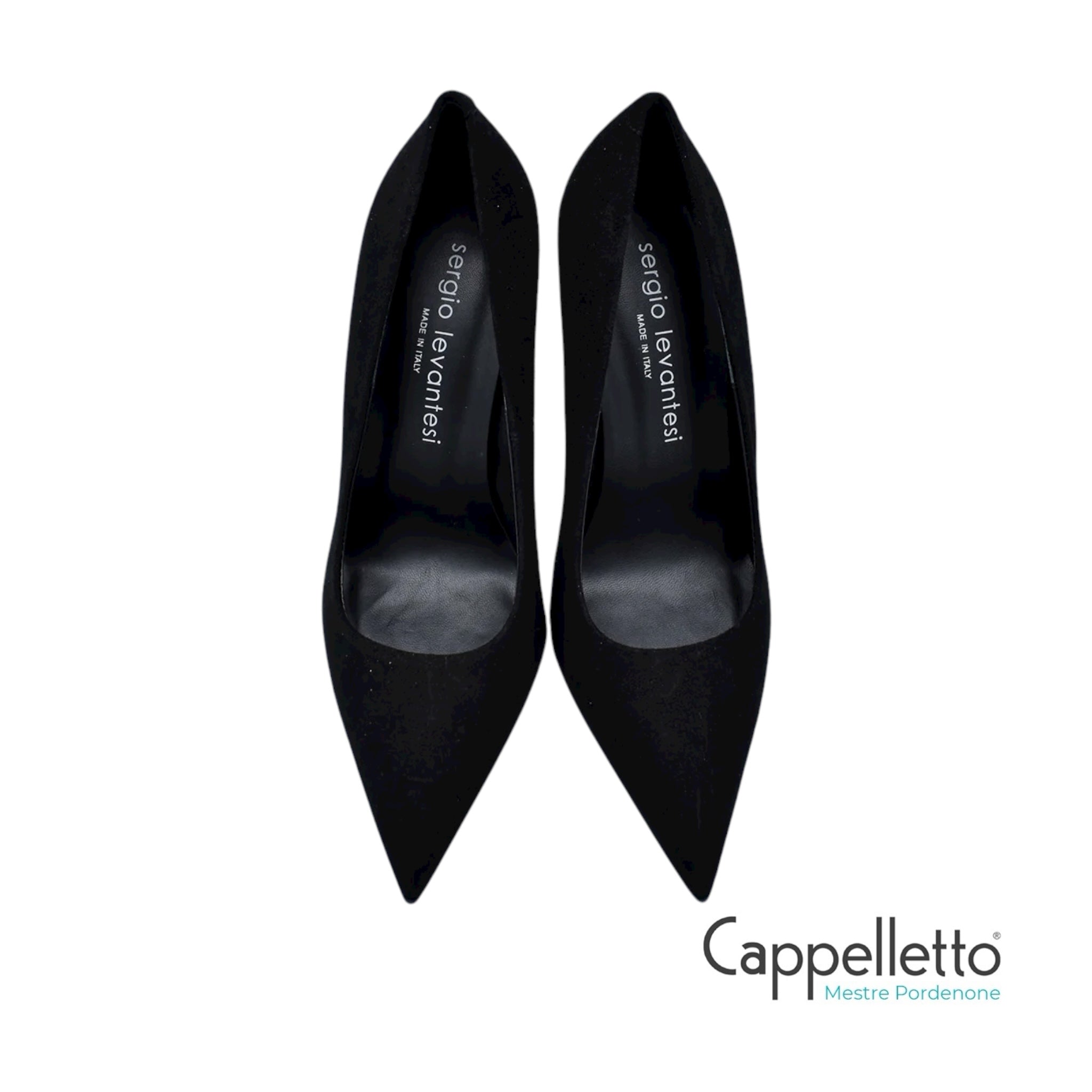 La décolleté Ley56 in Camoscio Nero di Sergio Levantesi è una scarpa elegante con un tacco da 100 mm.