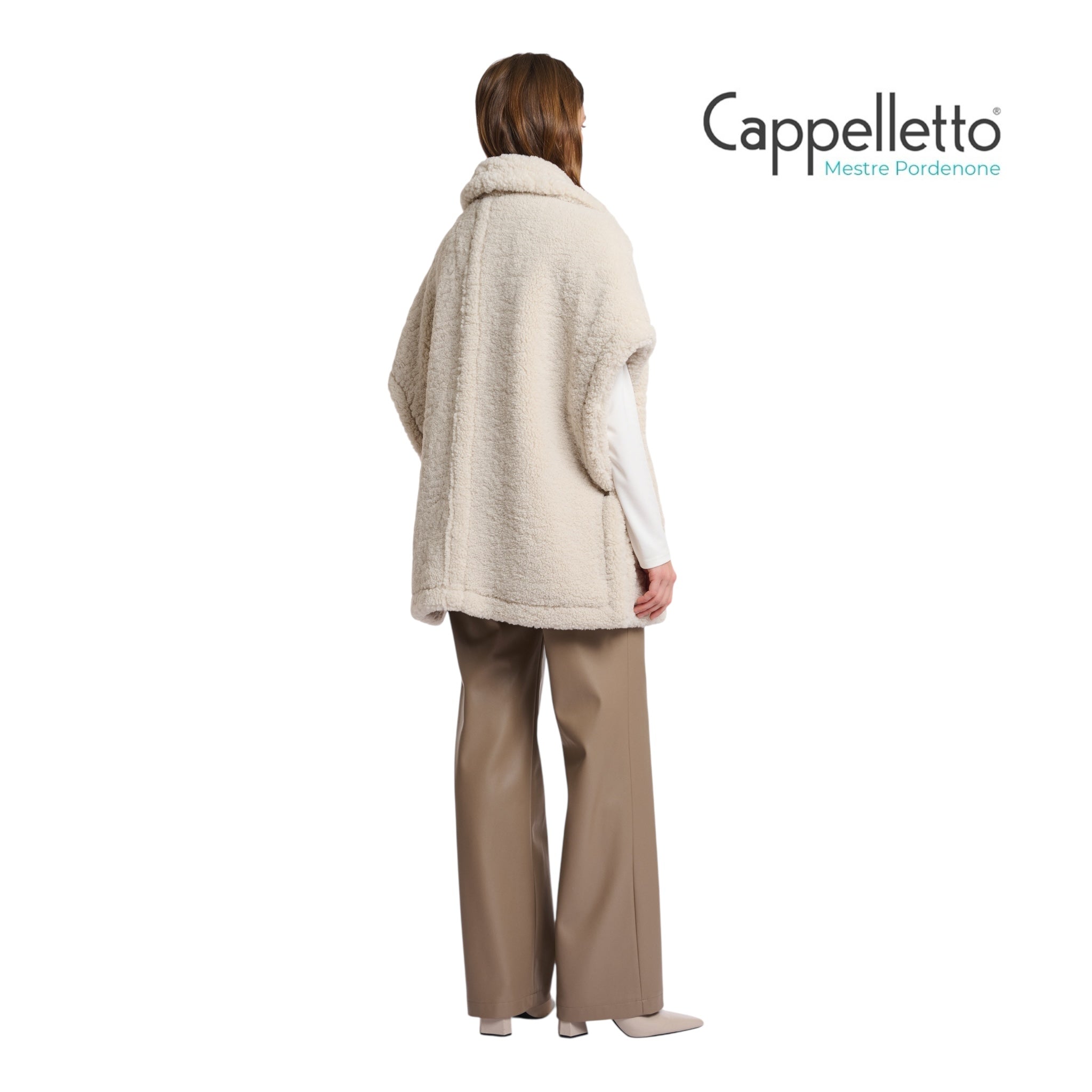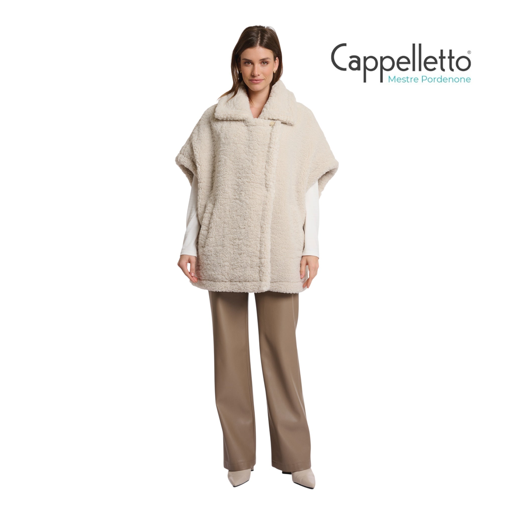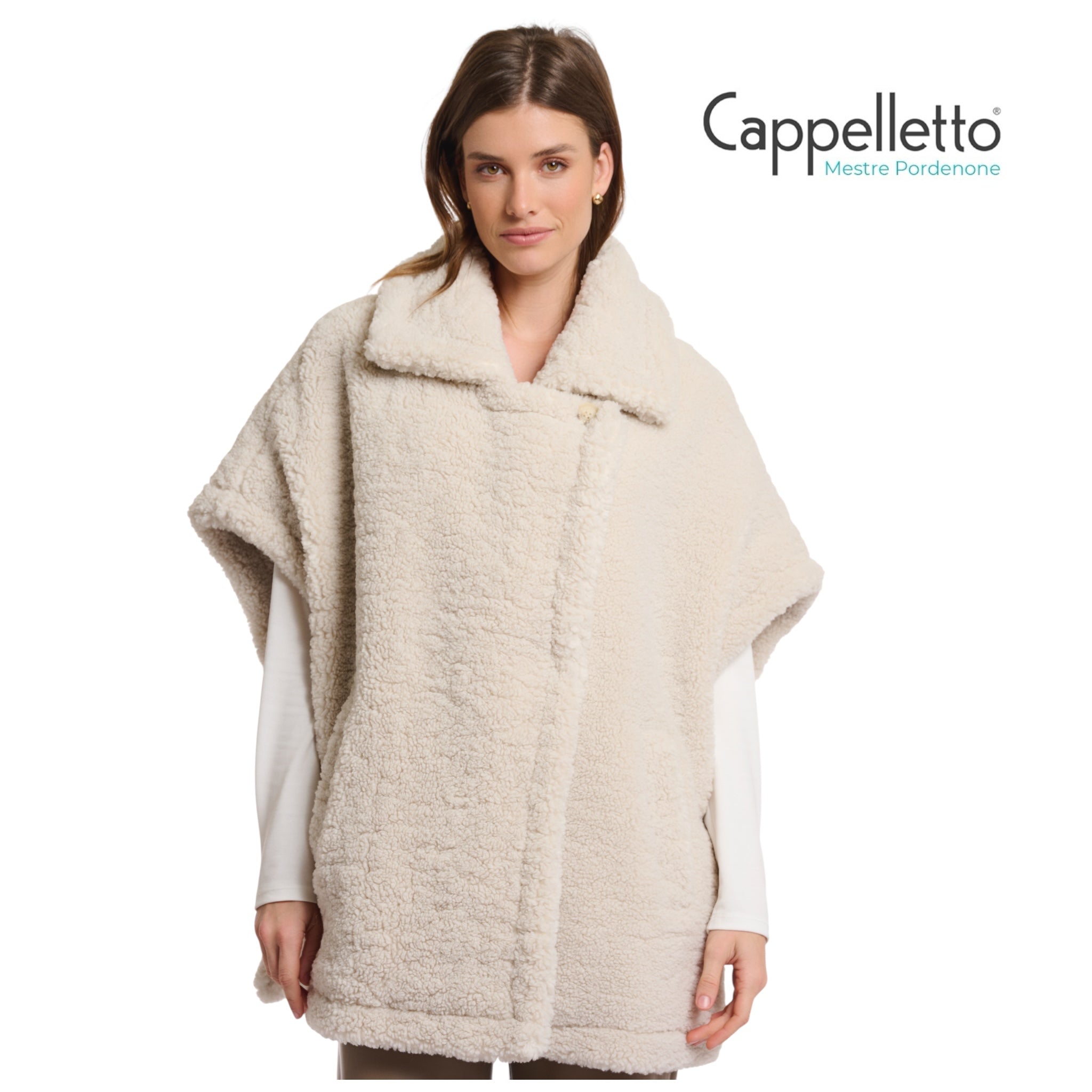 Questa mantella squadrata presenta tasche laterali, chiusura con bottoni, spalle basse e colletto con revers.