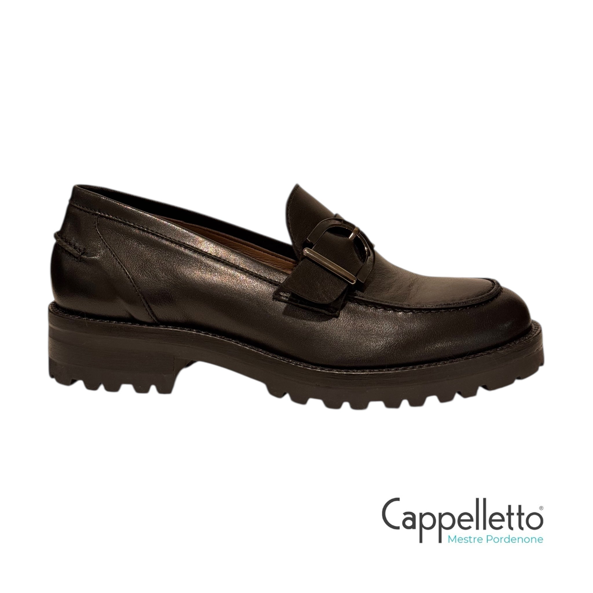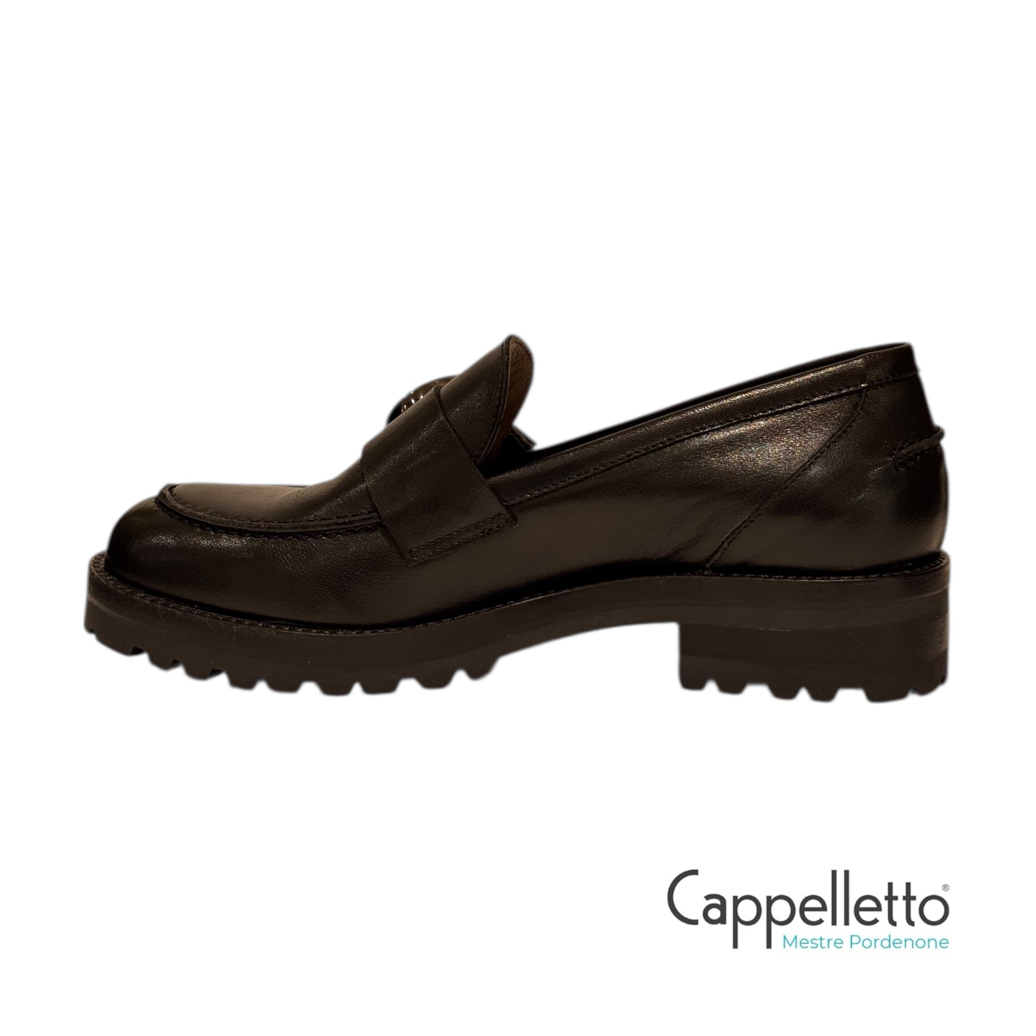 Mocassino donna in morbida pelle evolution nera. Fibbietta metallica laterale sulla fascetta della tomaia. Fodera in pelle. Tacco a blocco alto 3,5cm. Fondo in gomma carrarmato.