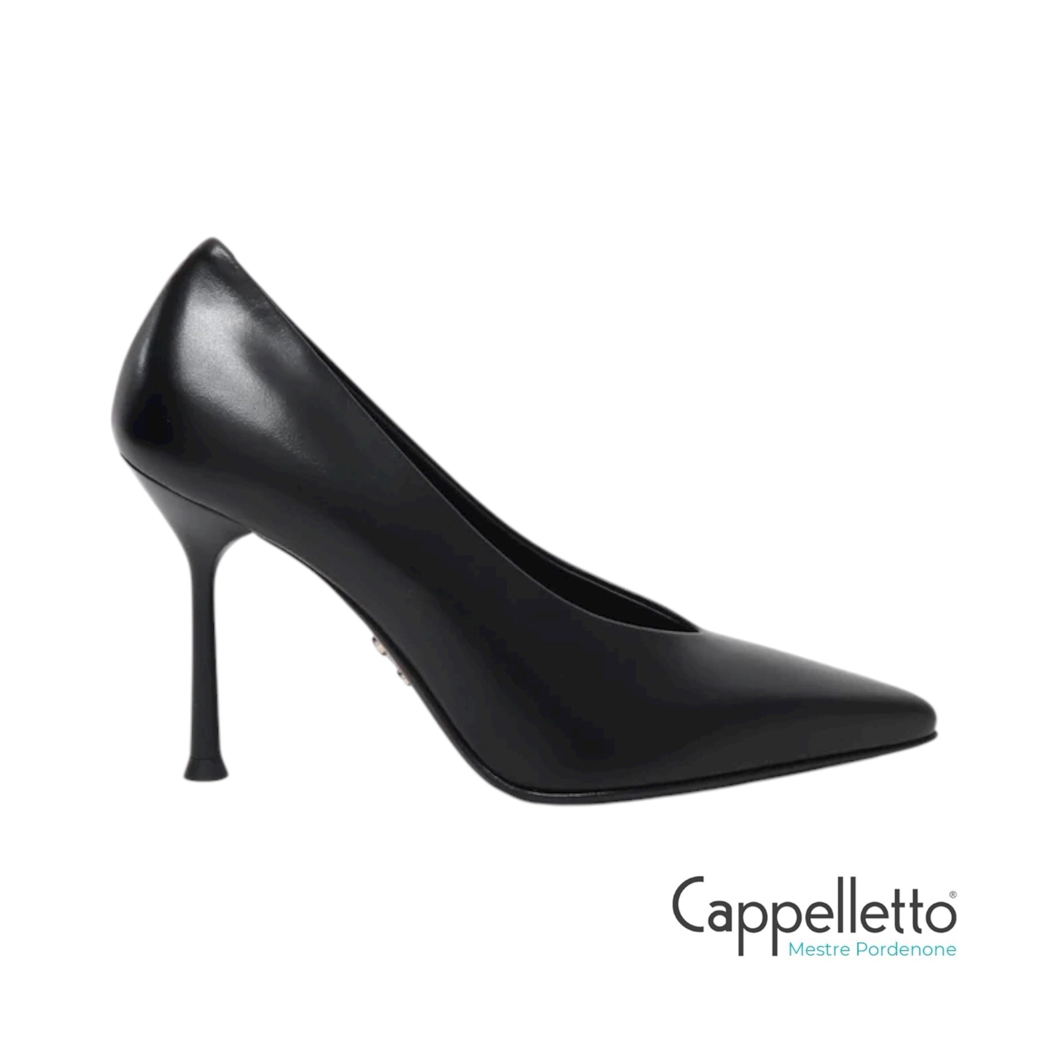 Décolleté nera in pelle liscia dalla mano setosa. Modello a punta con tacco a spillo di 9cm. Suoletta in vero cuoio leggermente imbottita per un maggior comfort.