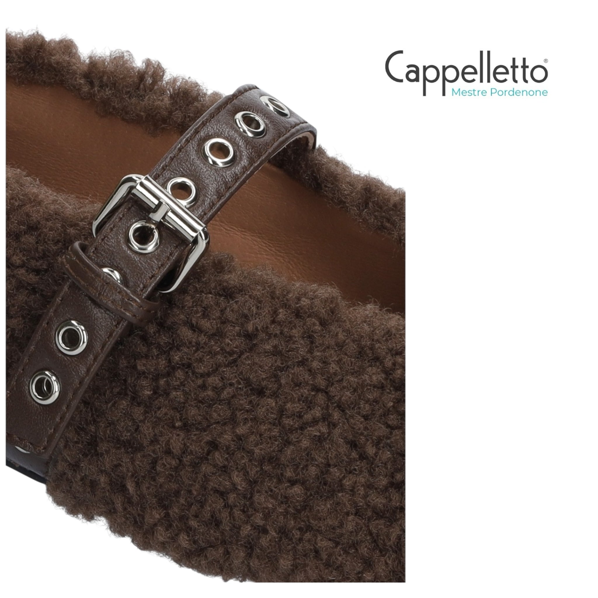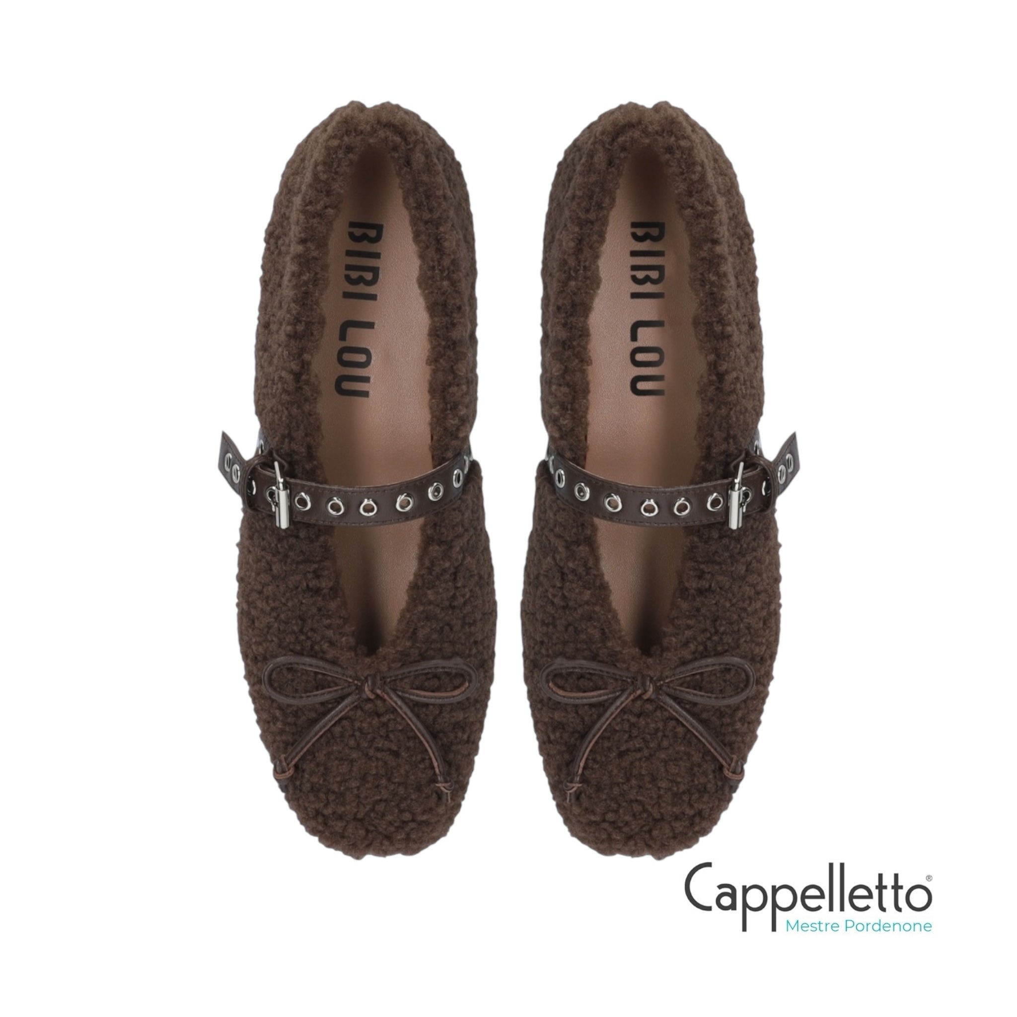 Ballerine da donna Bibi Lou realizzate in ecopelle di pecora marrone. Le ballerine Nashira presentano una punta tonda, un cinturino con borchie e un tacco basso di 1 cm.