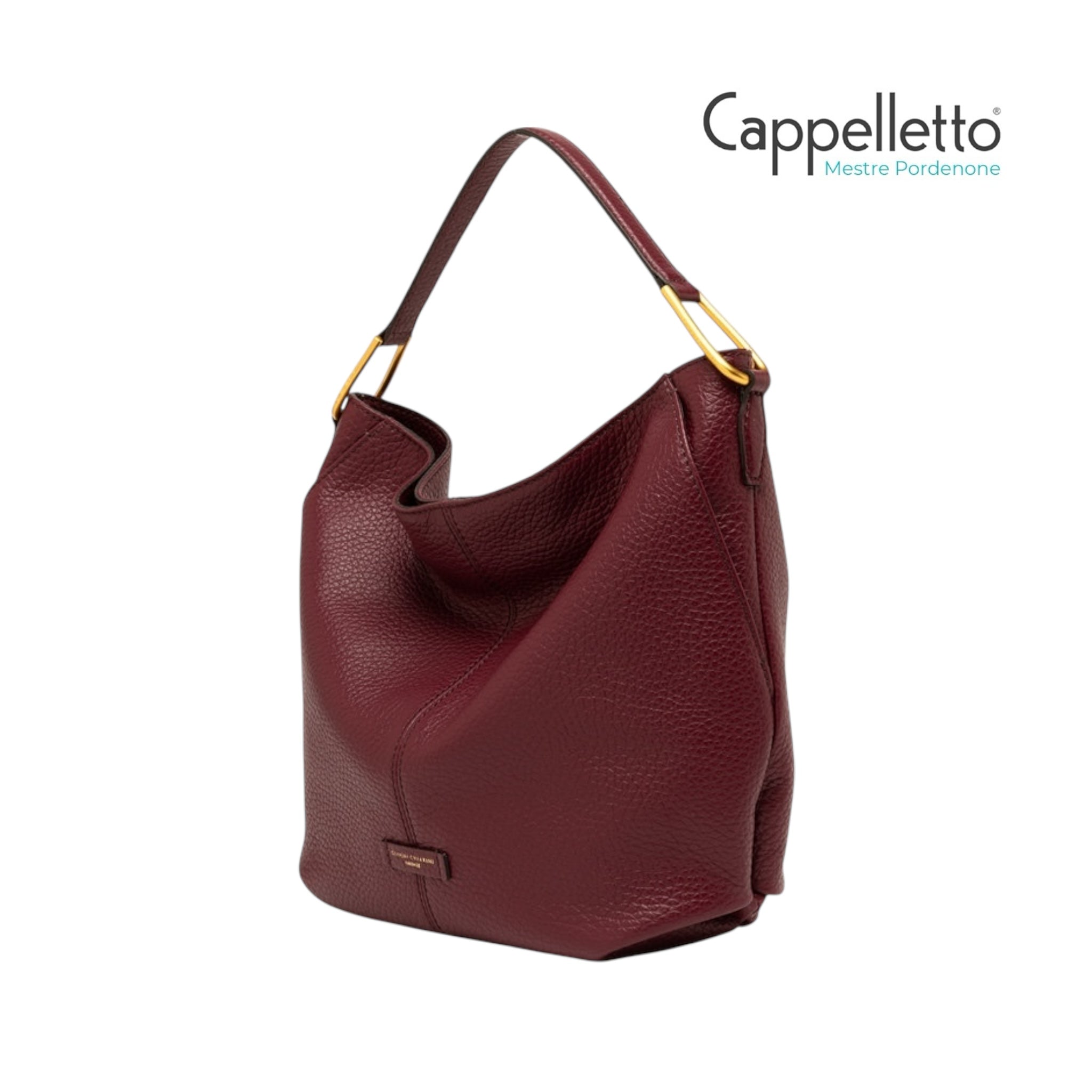 Borsa a sacca in pelle martellata con portabilità a spalla o a tracolla.