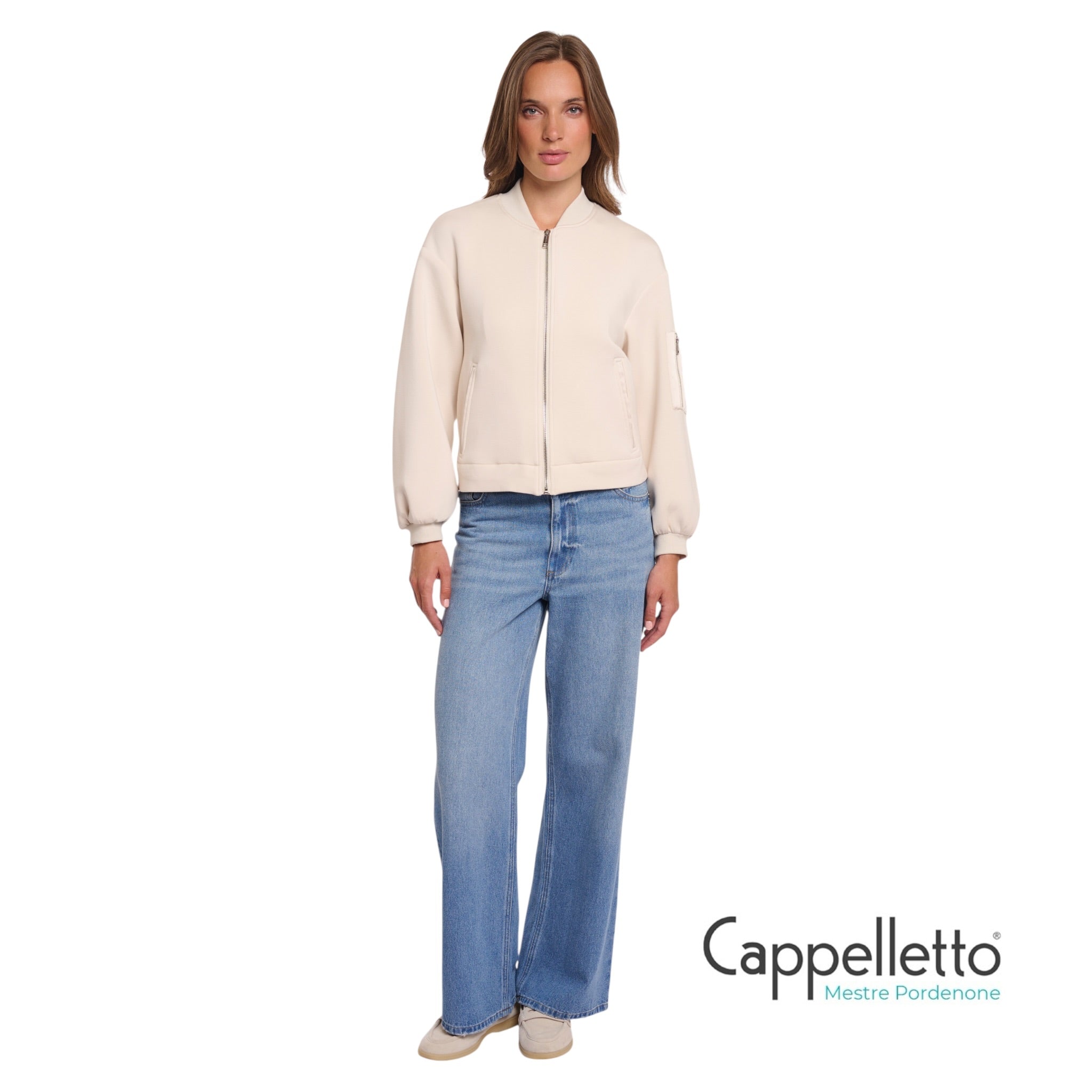 Progettato con un'elegante chiusura a cerniera, due tasche frontali e un ulteriore dettaglio con cerniera sulla manica, conferisce un sottile tocco di praticità alla sua silhouette contemporanea.