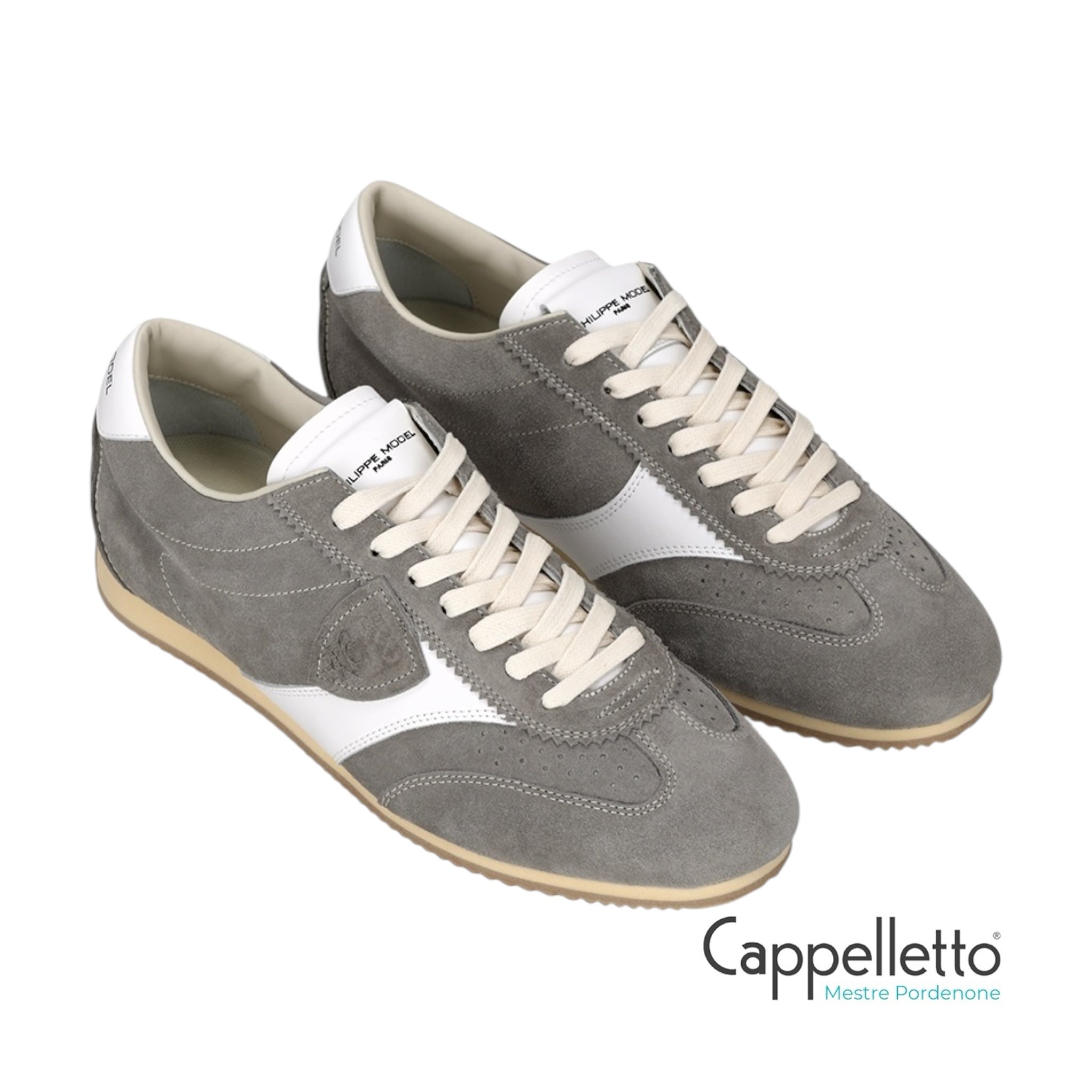 Sneaker in suede grigio con dettagli in pelle bianca.