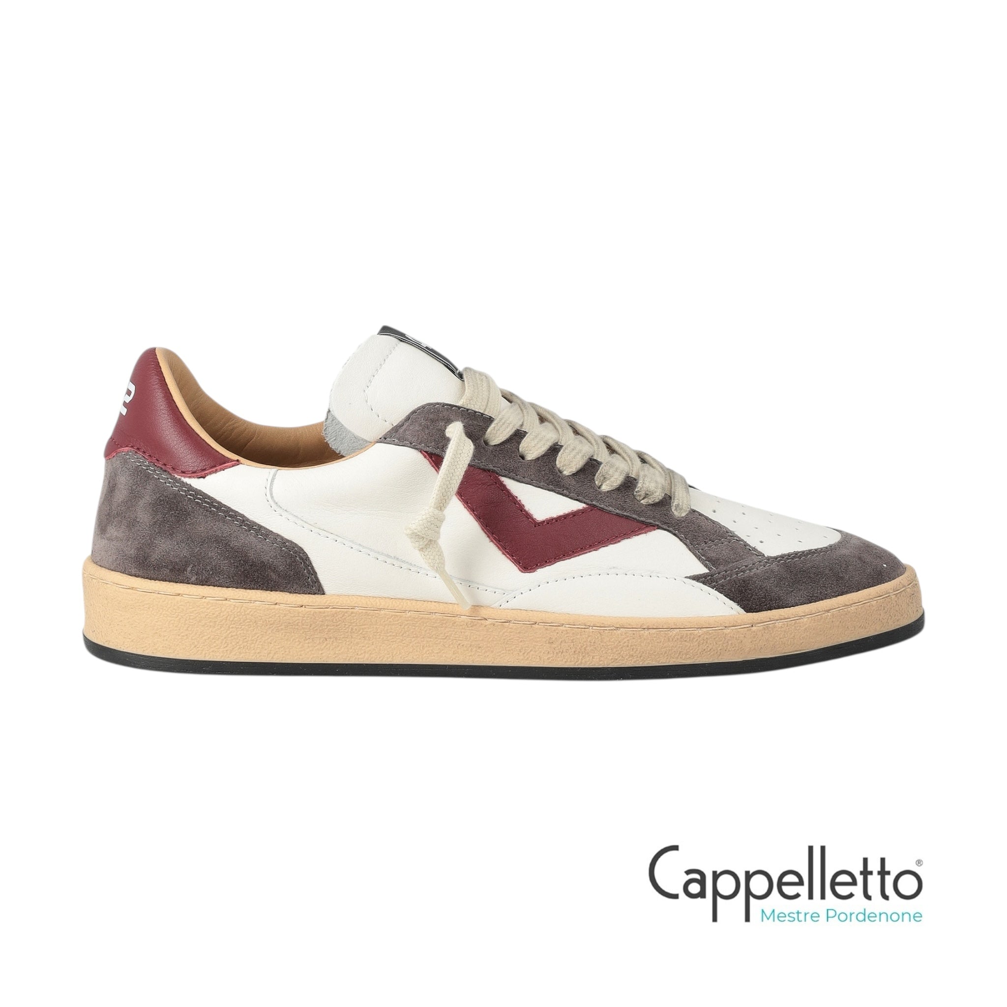 Caratterizzata da linguetta in pelle bianca con patch applicata, inserti in suede grigi e logo laterale in pelle rossa.
