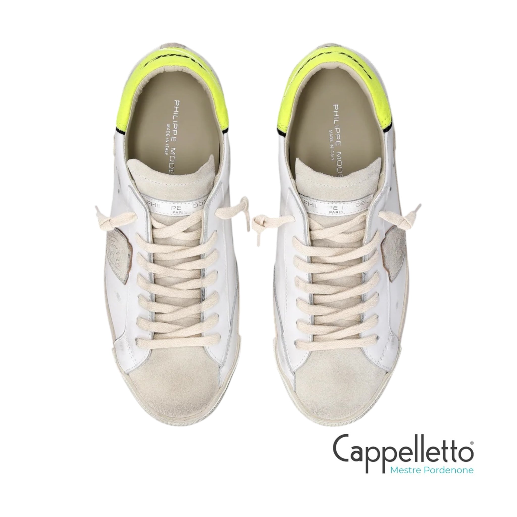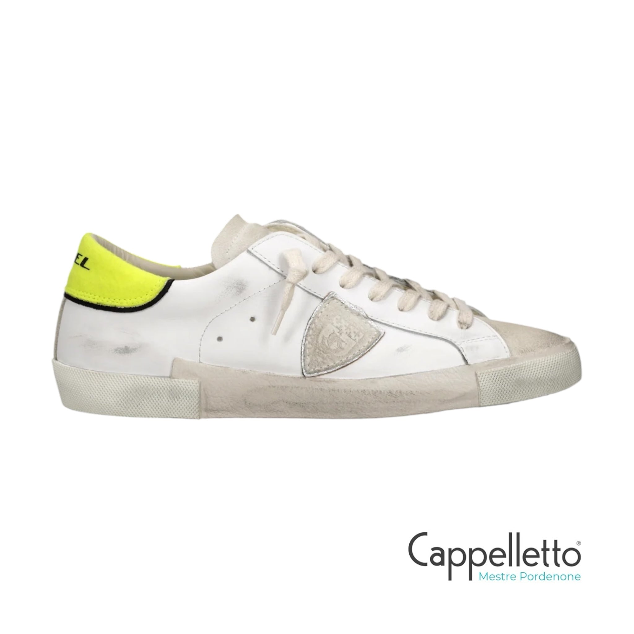 Le linee street vengono addolcite da una tomaia in pelle di vitello effetto used con inserti in suede beige e spoiler in feltro giallo fluo con logo.