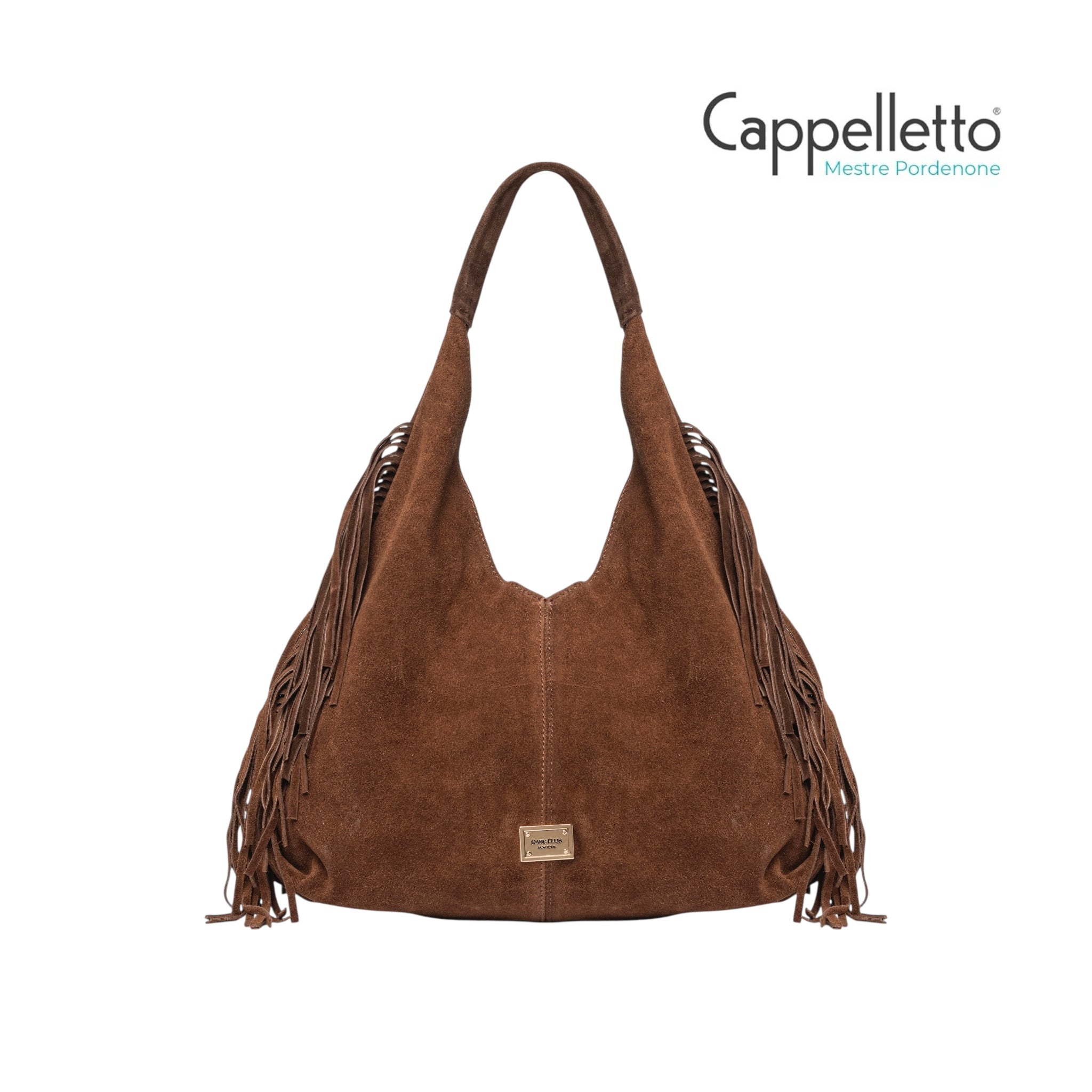 Borsa "Reanna cm" Marc Ellis, colore cuoio, pelle scamosciata, dettaglio frange laterali, chiusura con bottone a pressione, manico singolo ampio, logo lettering dorato frontale.