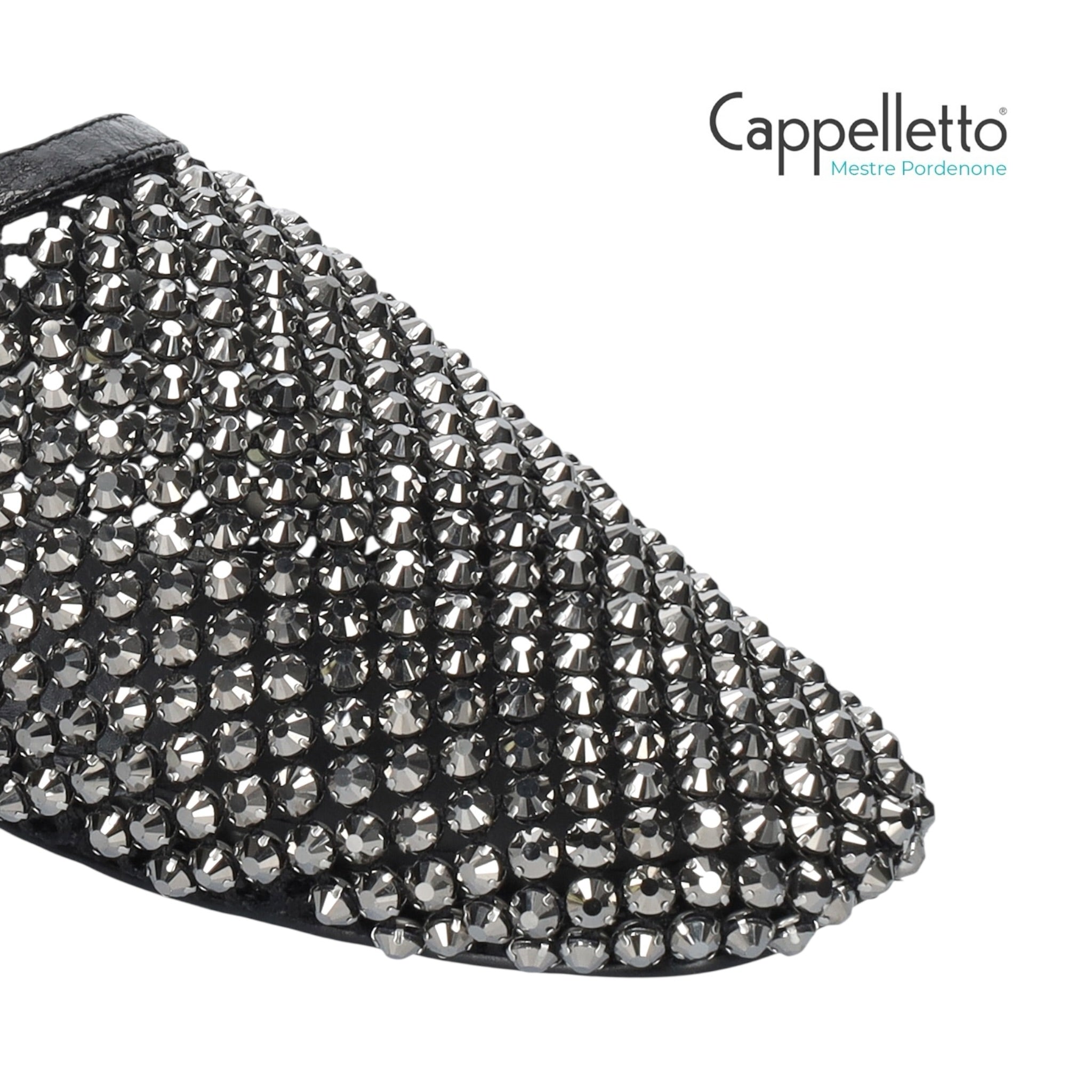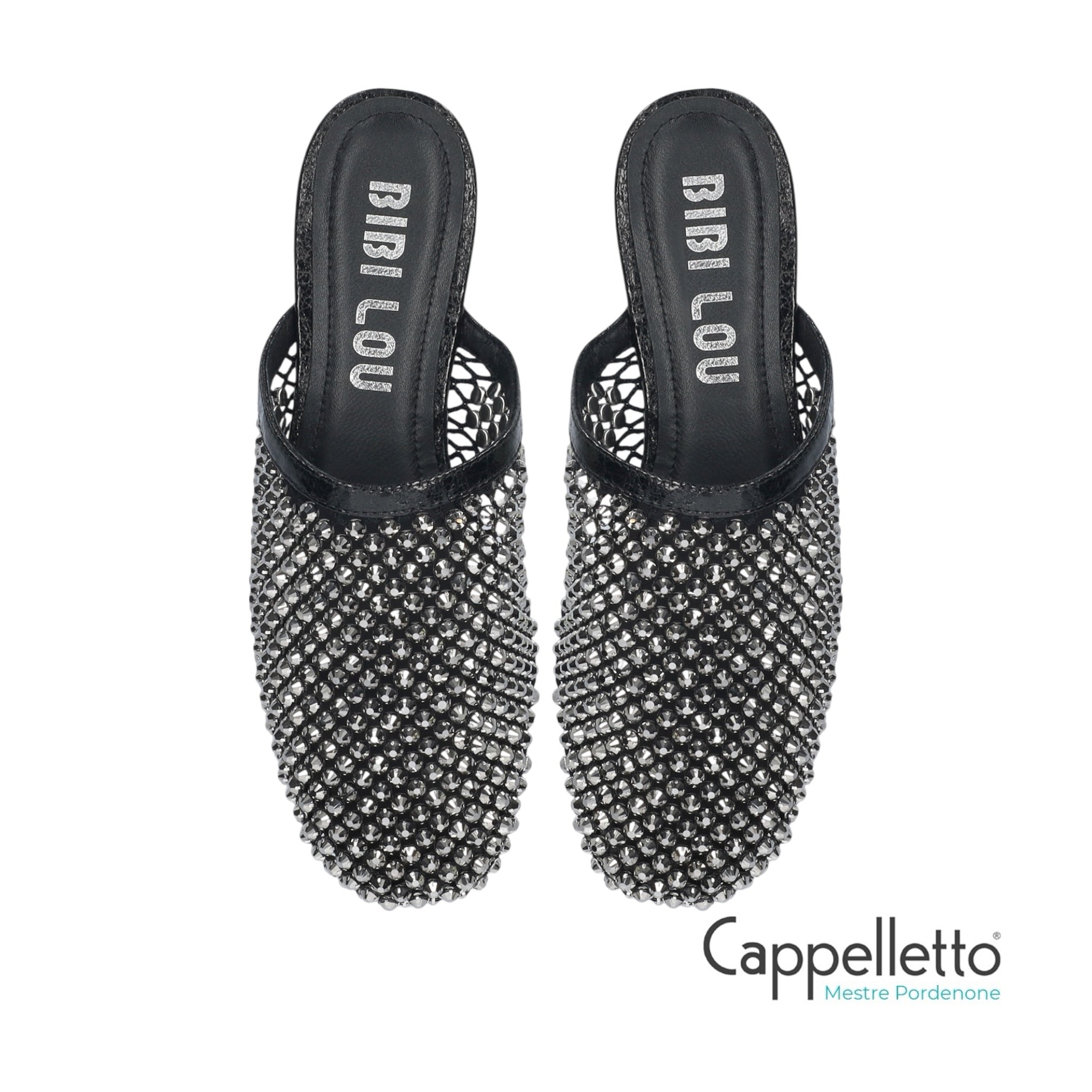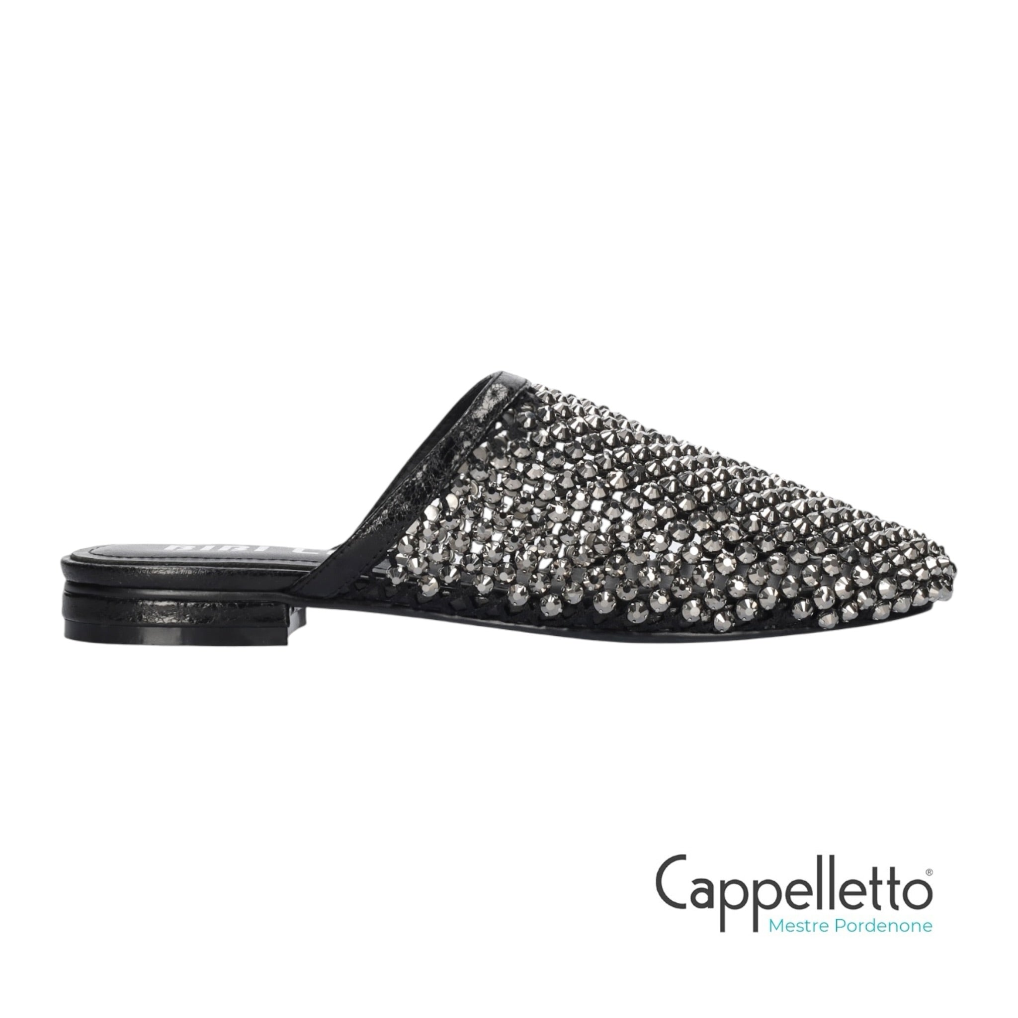 Ciabattina gioiello in pelle nera con tomaia in maglia metallica e strass argento.