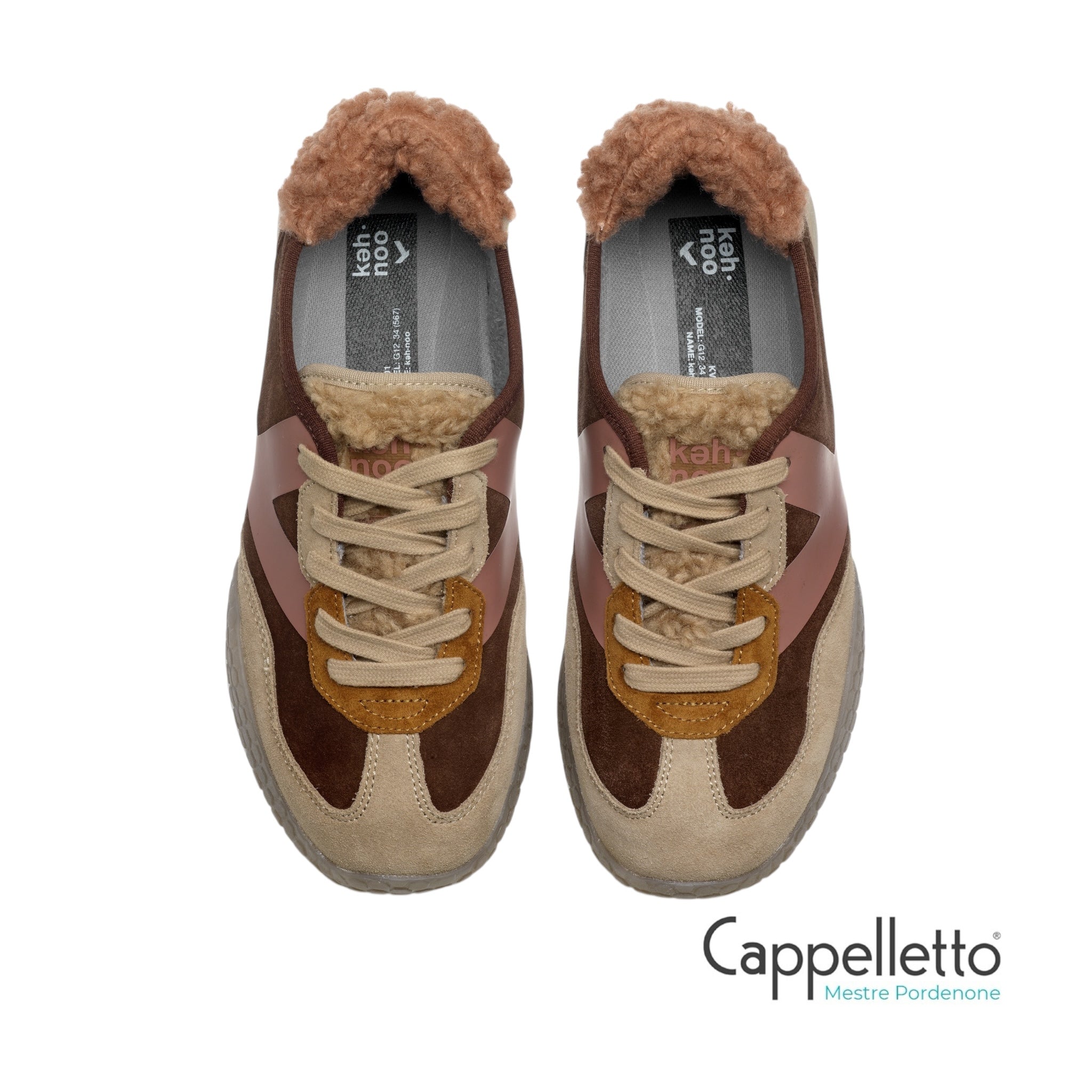 Sneaker vintage contemporanea. Tomaia in pelle scamosciata bovina, con linguetta e collarino in pelliccia ecologica. Lacci in cotone. Suola in gomma, con intersuola in EVA ammortizzata. Fodera in tessuto spugna. Soletta interna rimovibile in schiuma super morbida, foderata in rete.