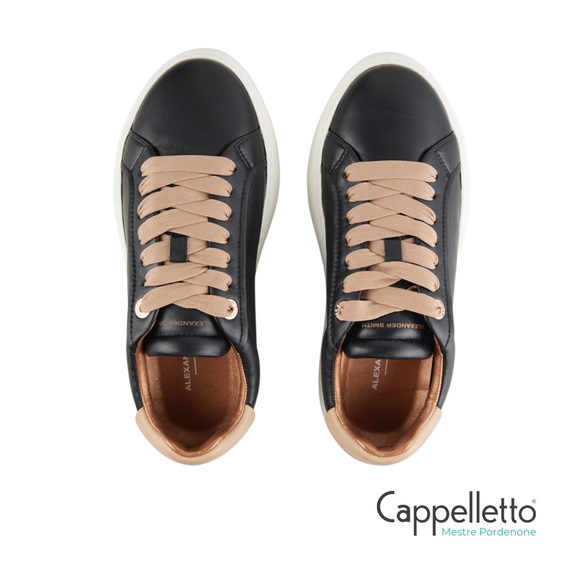 Il design moderno e sofisticato rende le SOHO il compagno perfetto per completare qualsiasi outfit, dal casual chic al formale raffinato, in questa variante in pelle liscia nera e dettagli nude.