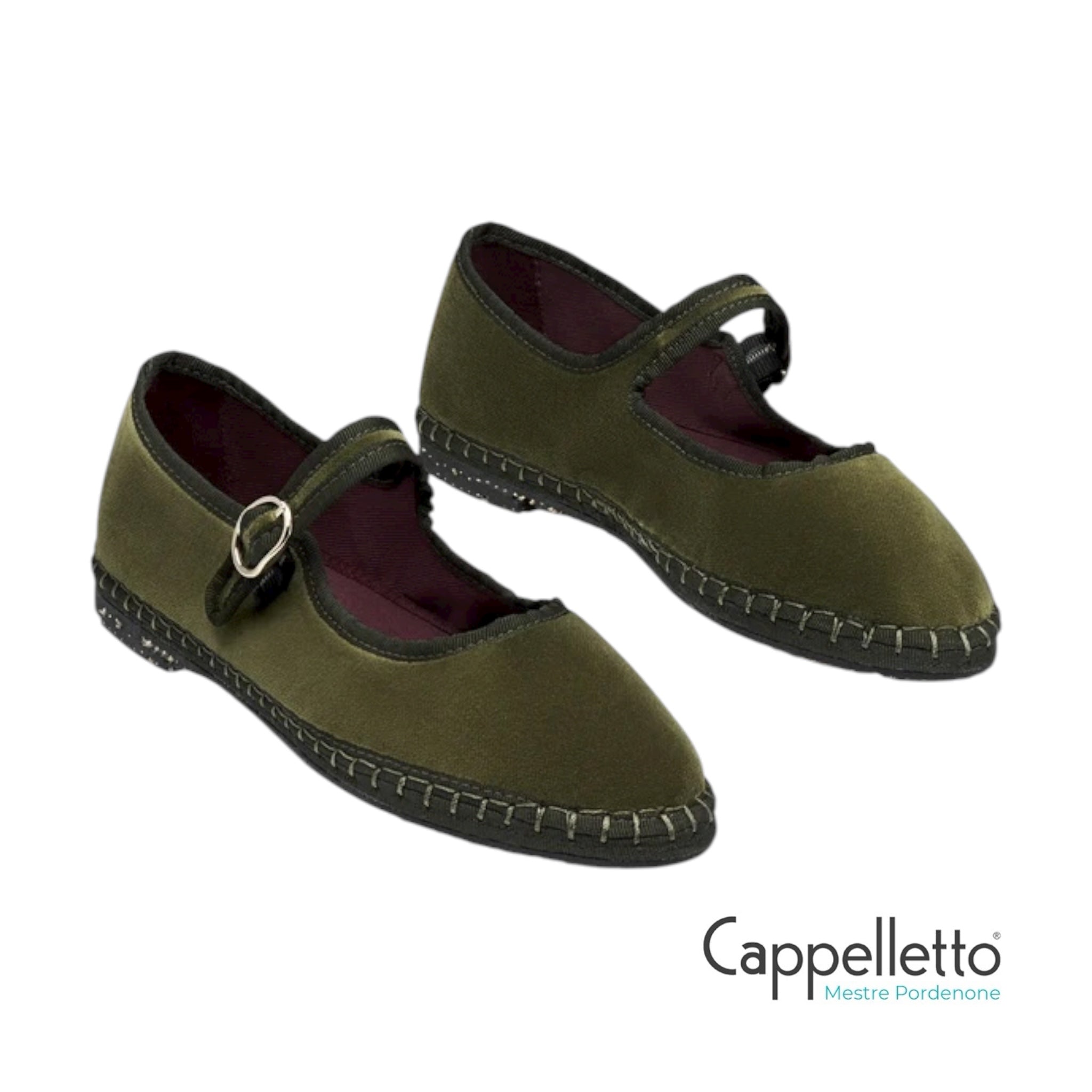 Mary Jane in velluto verde con profili verdi e chiusura con fibbia.