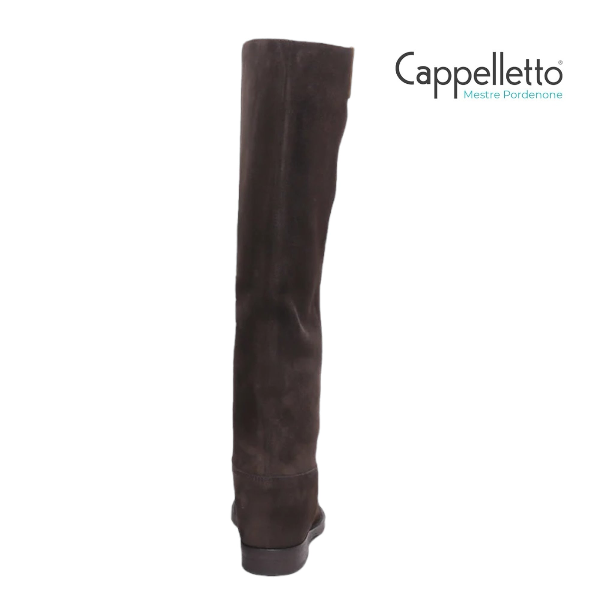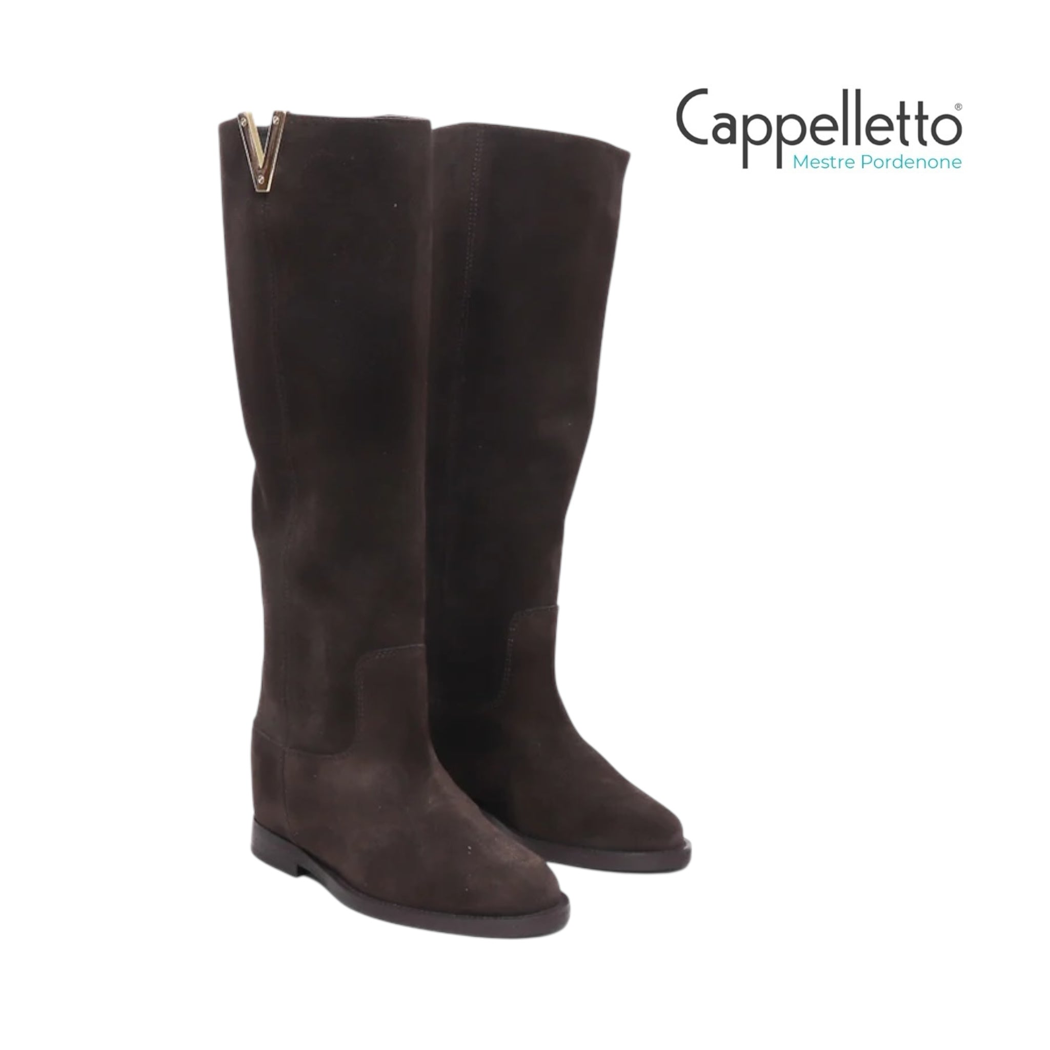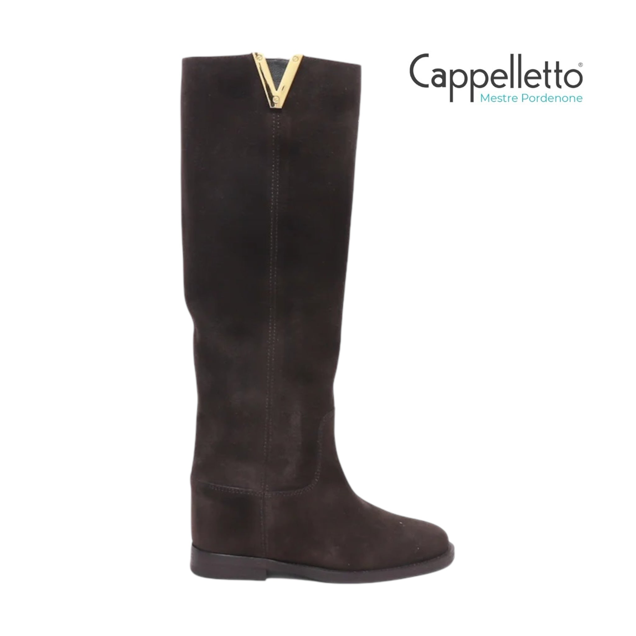 Iconico stivale Via Roma 15 con spacco laterale, dettaglio “V” in metallo e zeppa interna nella bellissima versione desirè marrone testa di moro.
