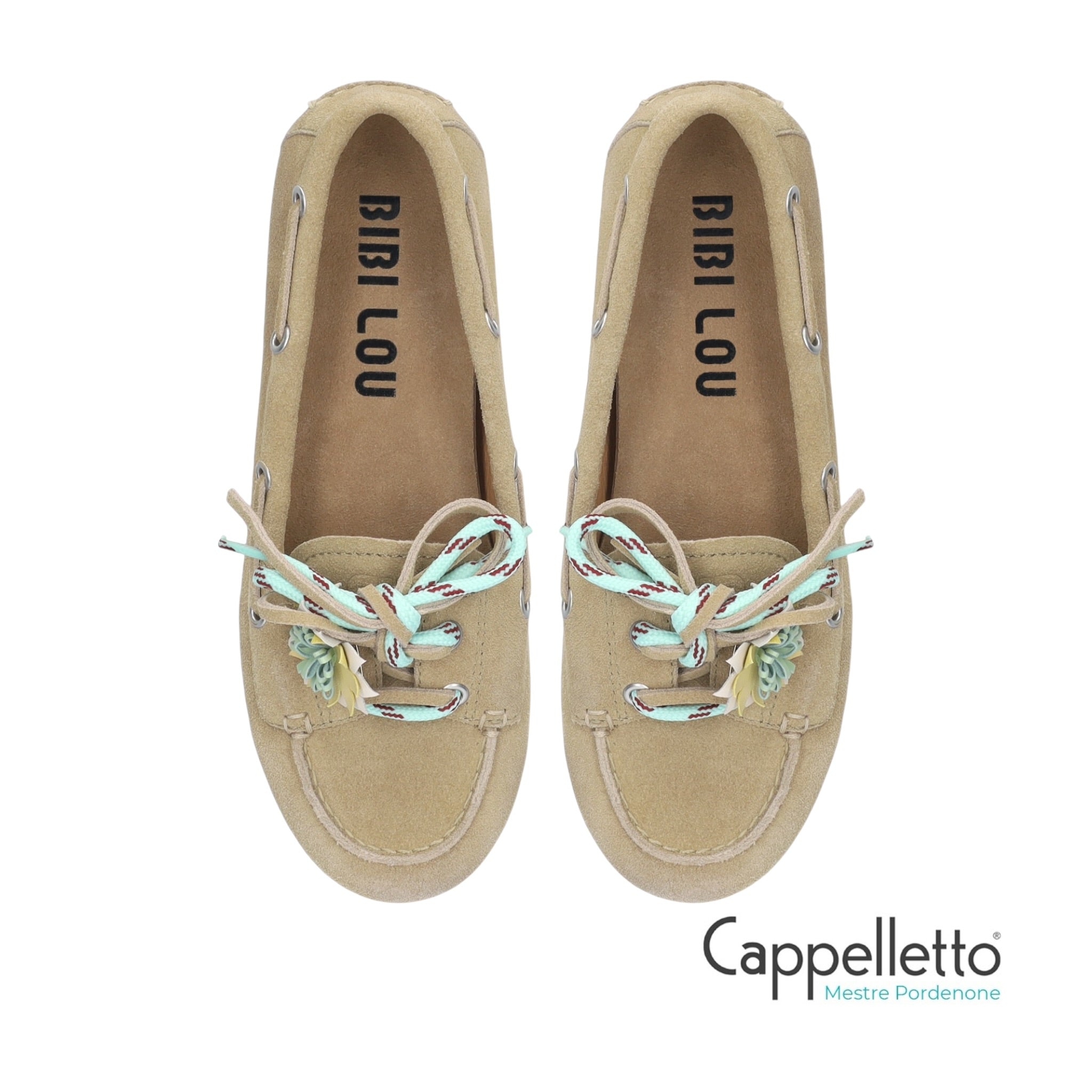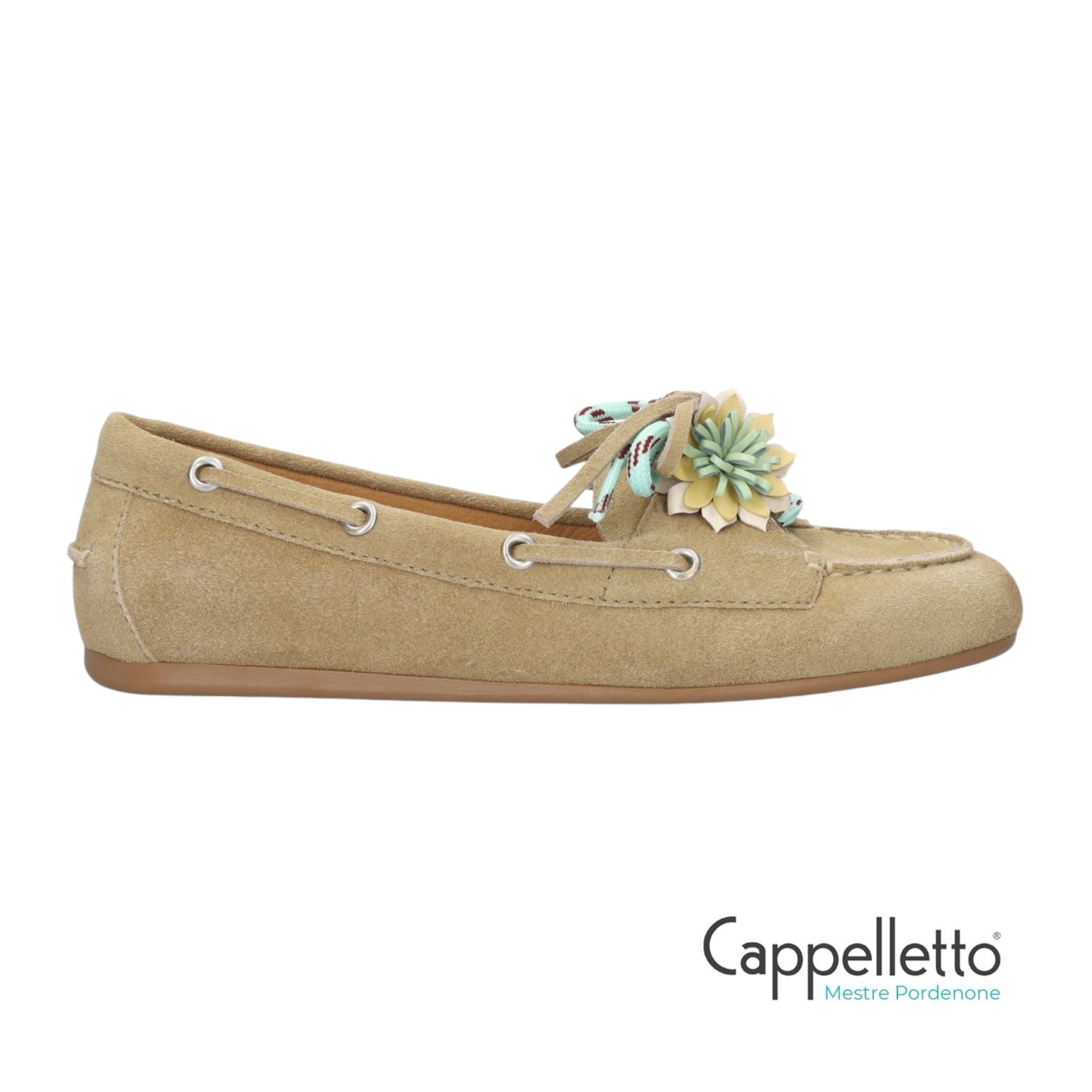 Mocassino donna in camoscio color beige con allacciatura a due fori e motivo floreale in pelle sulla mascherina.