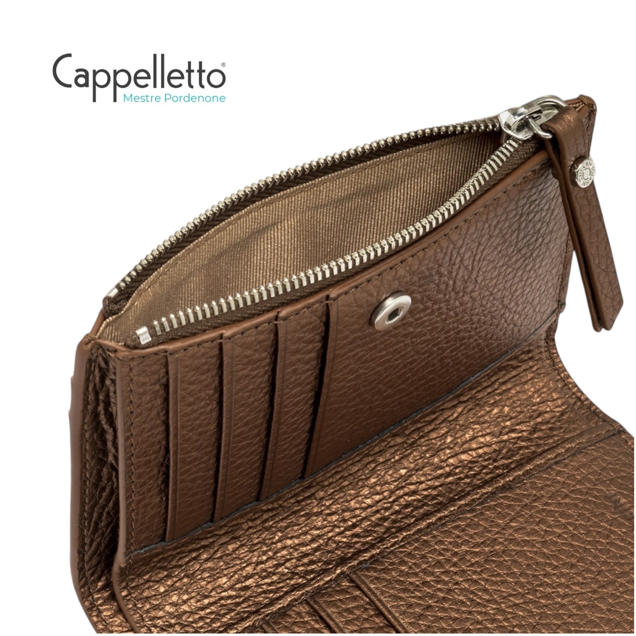 Pratico portacarte e porta soldi con zip ed alloggi per tessere in pelle martellata laminata bronzo.
