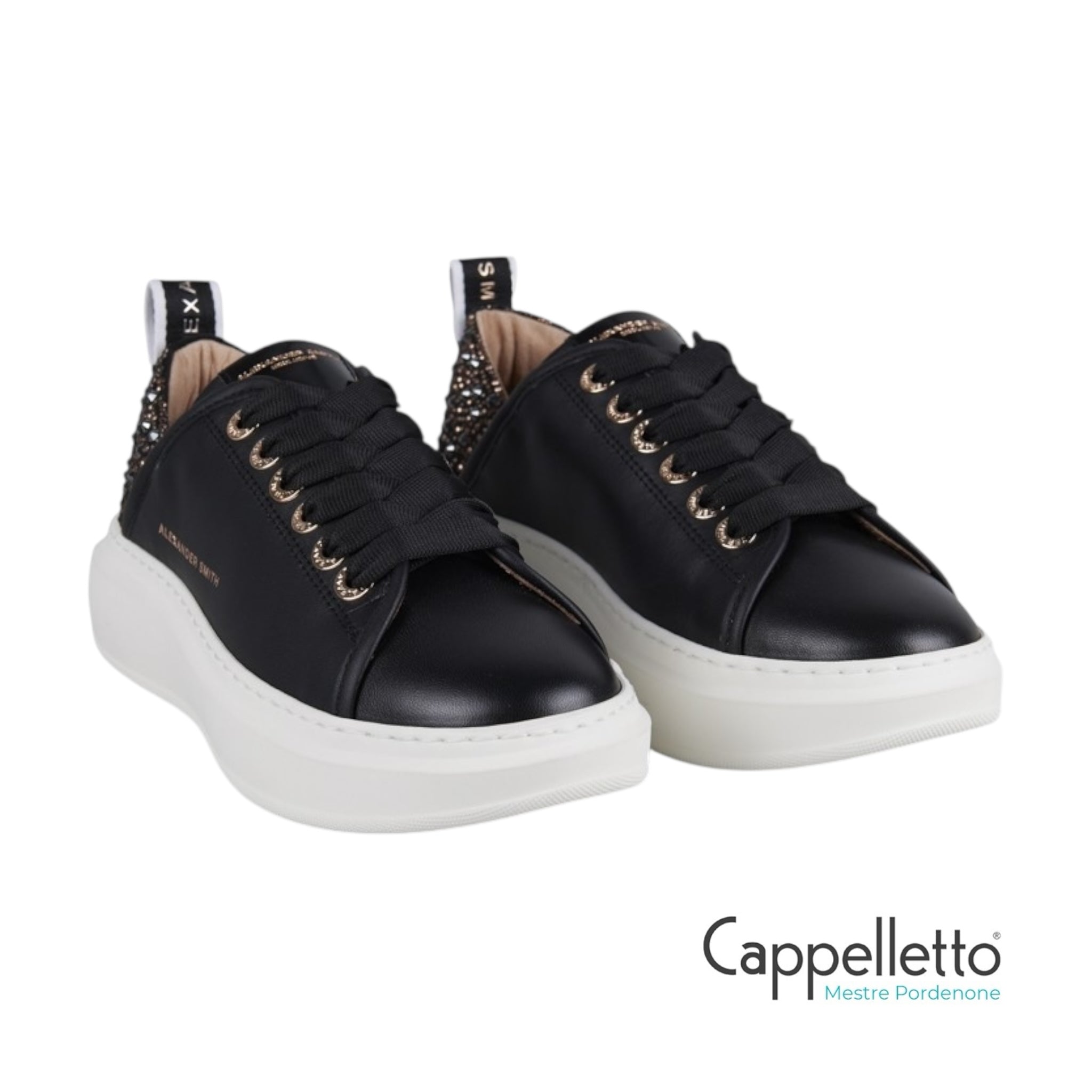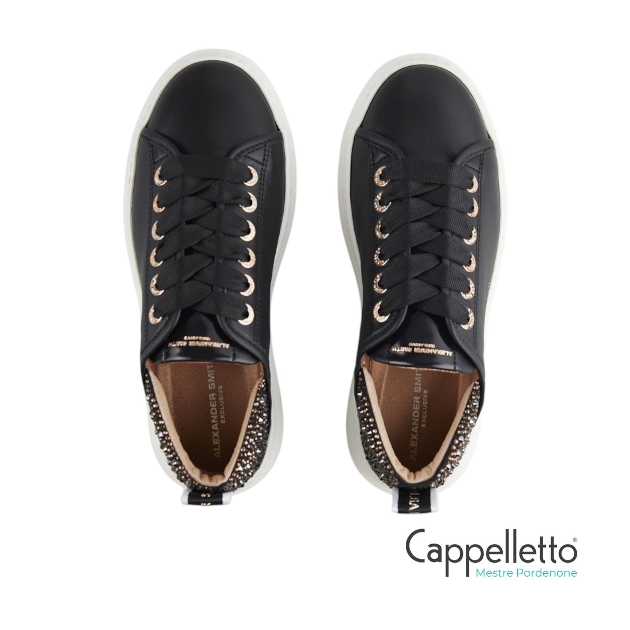 Le Wembley rappresentano l’equilibrio tra comodità, stile e sobrietà, ai quali si aggiunge modernità grazie ai dettagli unici che fanno la differenza, in questa versione in pelle nera e tallone nero con strass.