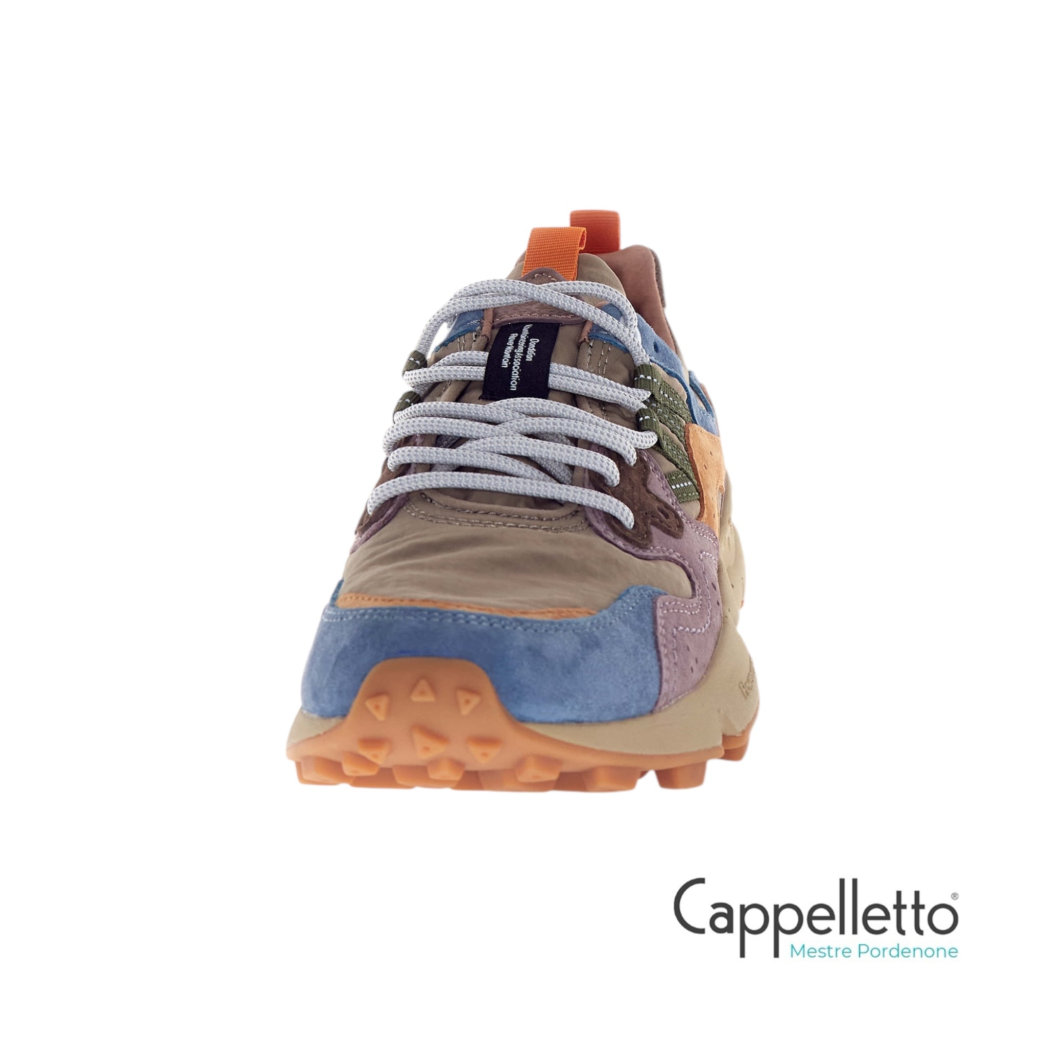 Sneaker in tessuto tecnico e suede, con occhielli rinforzati, lacci trekking, soletta interna in sughero anatomica e antibatterica.
