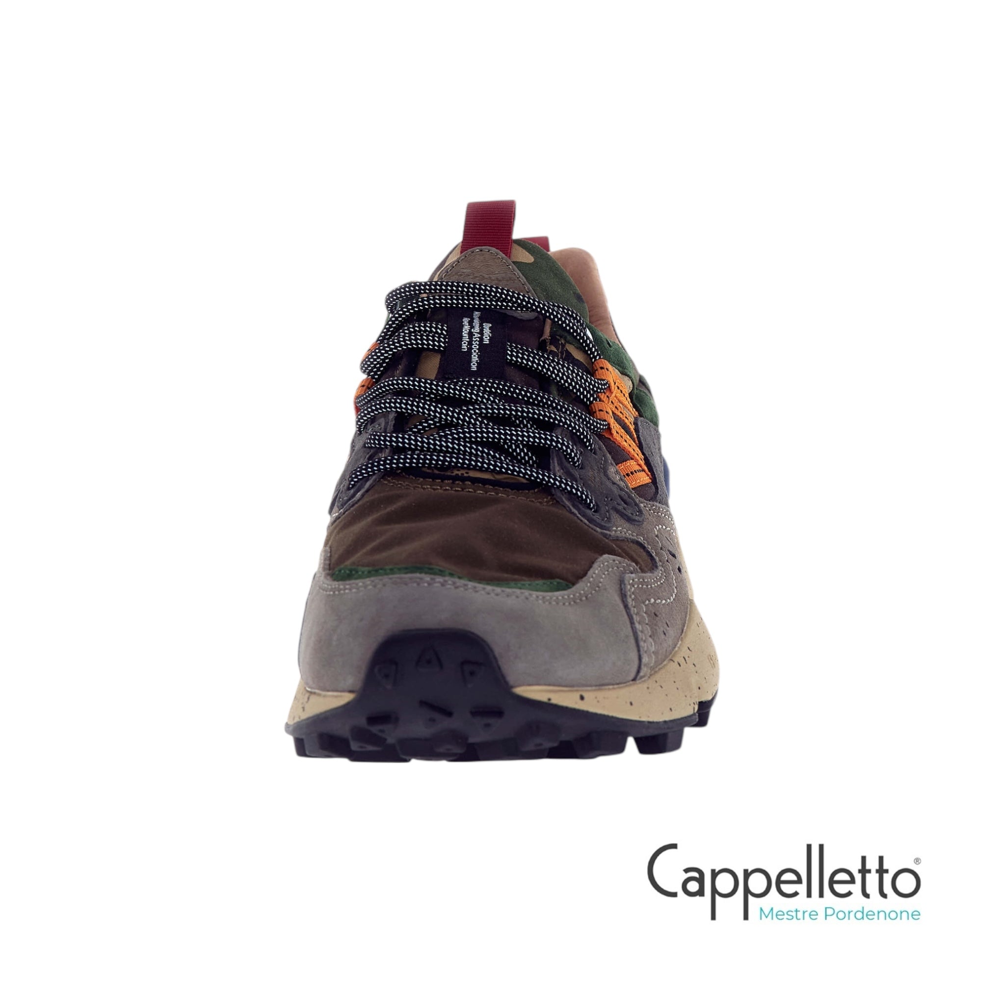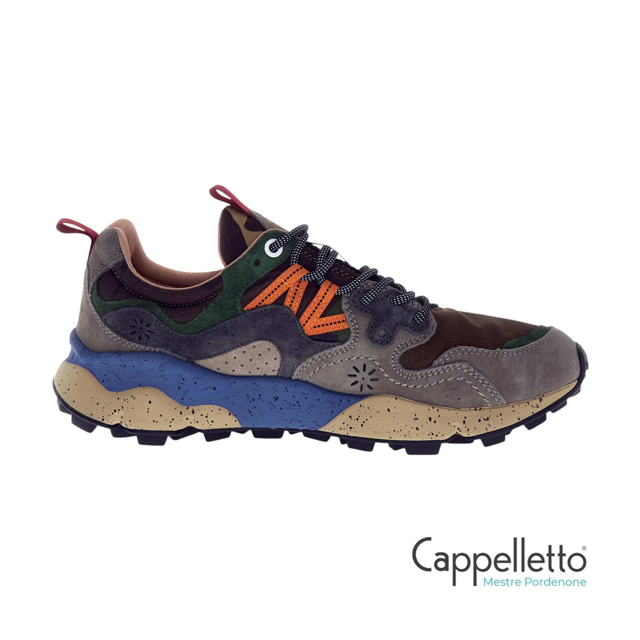 Sneaker in tessuto tecnico e suede, con occhielli rinforzati, lacci trekking, soletta interna in sughero anatomica e antibatterica.