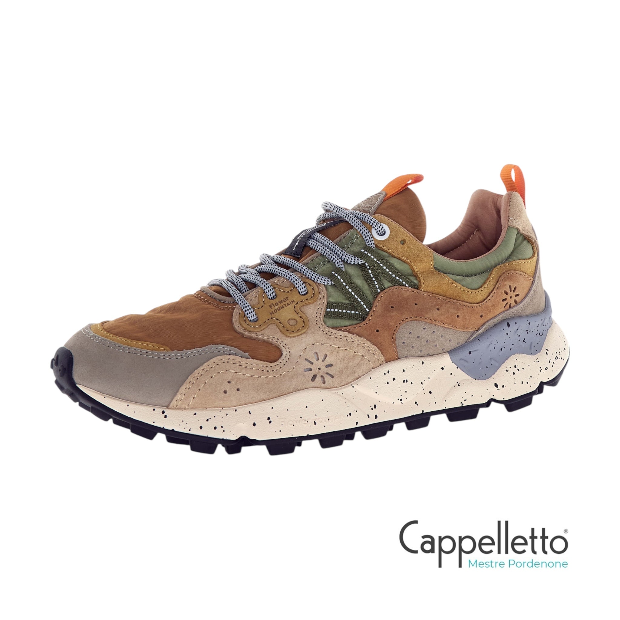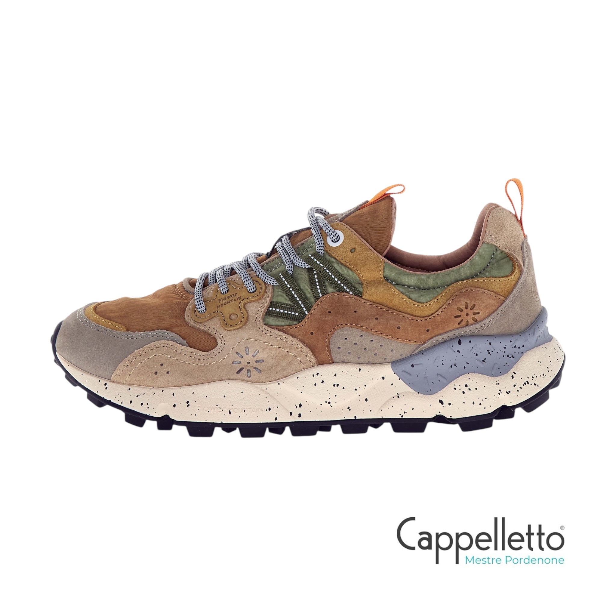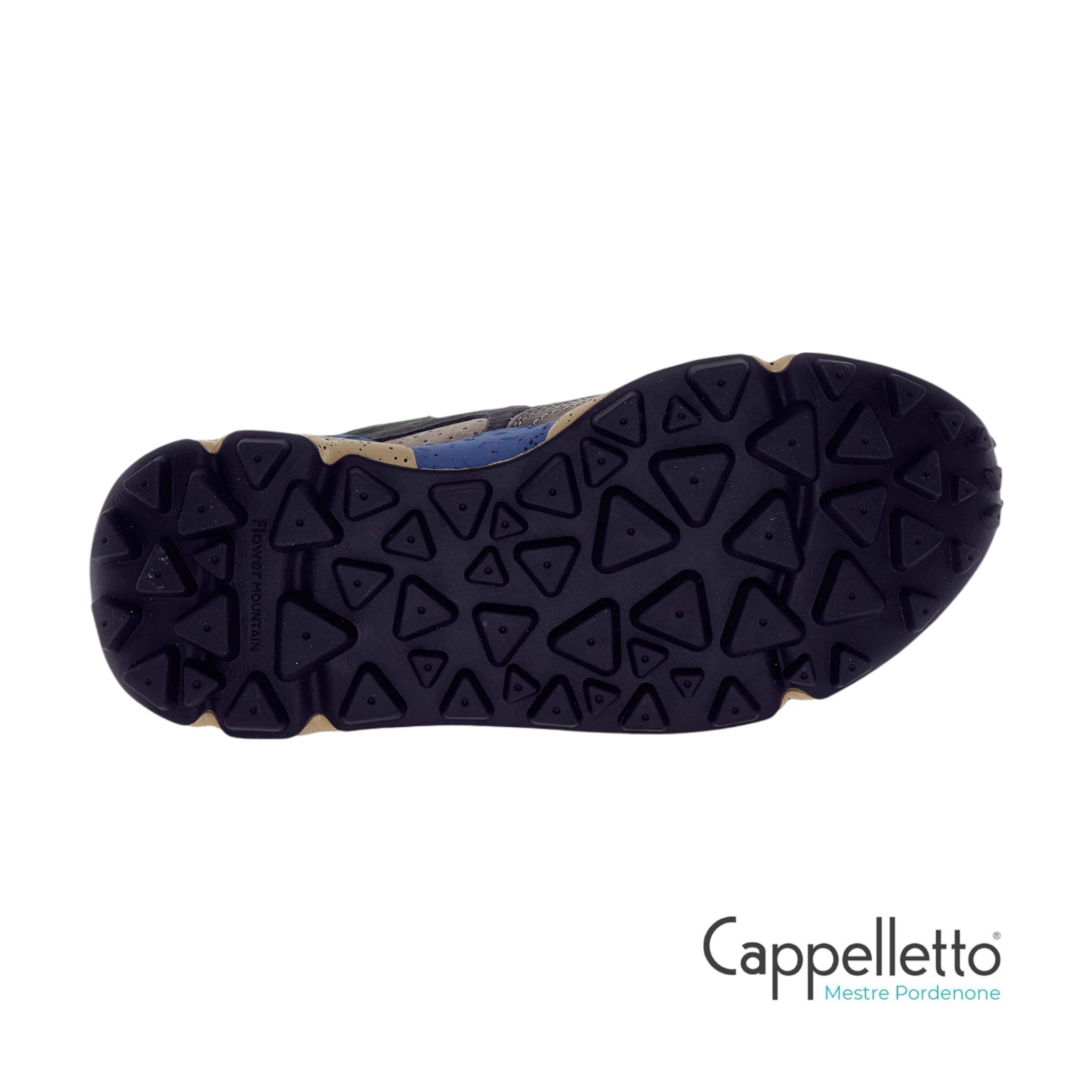 Sneaker in tessuto tecnico e suede, con occhielli rinforzati, lacci trekking, soletta interna in sughero anatomica e antibatterica.