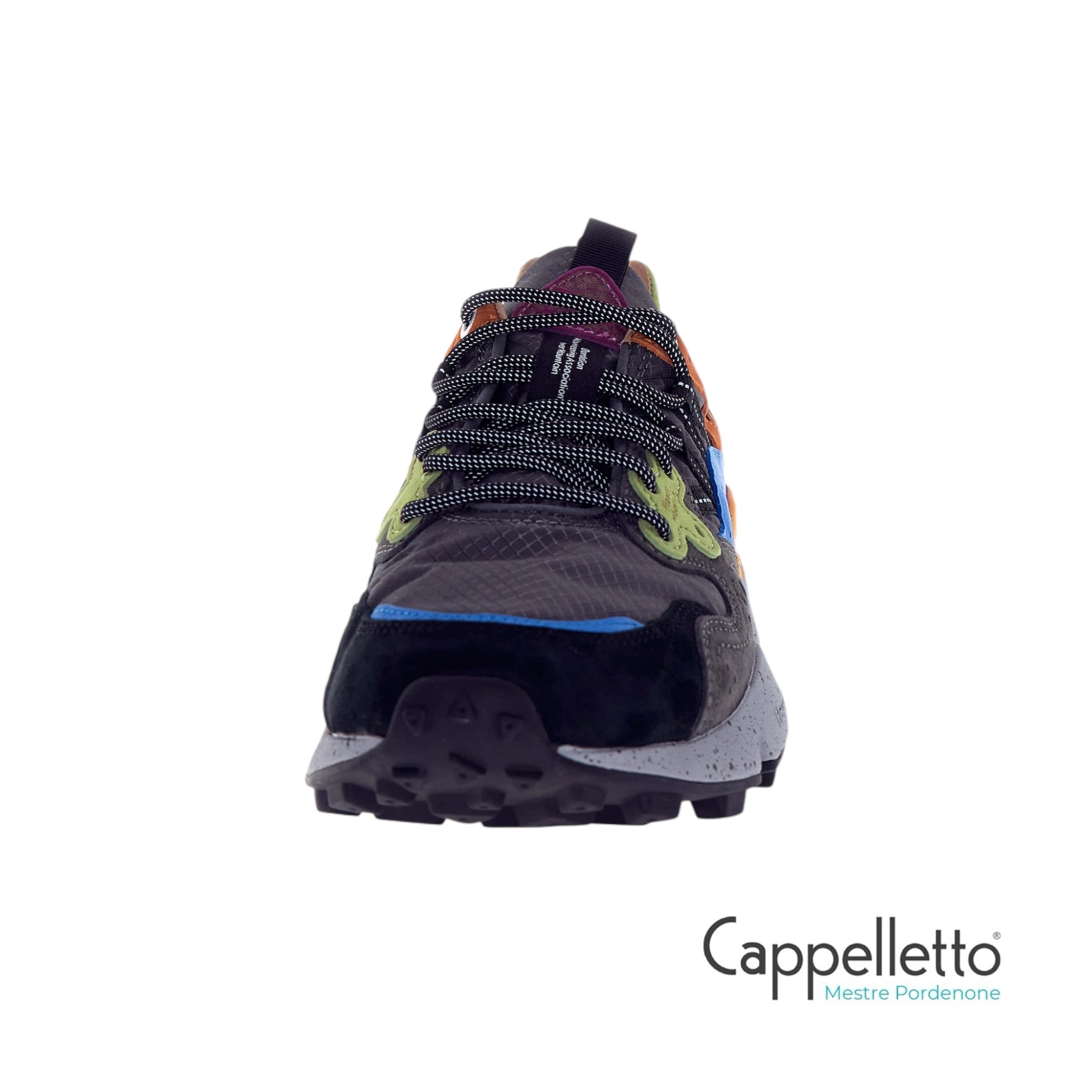 Sneaker in tessuto tecnico e suede, con occhielli rinforzati, lacci trekking, soletta interna in sughero anatomica e antibatterica. Suola in gomma ultraleggera con battistrada dentellato.